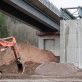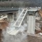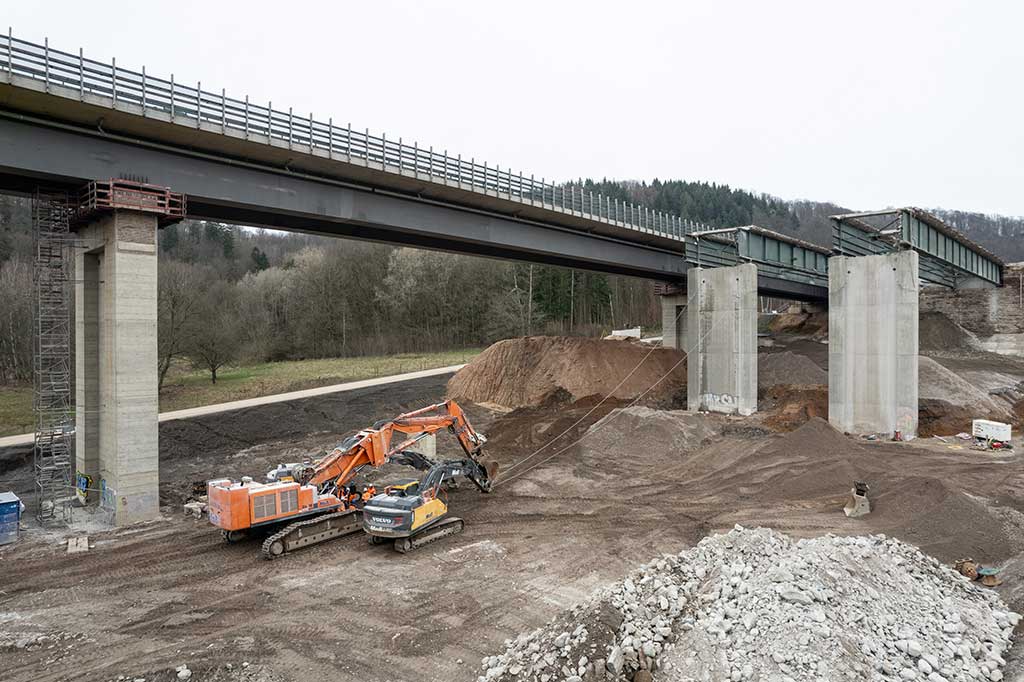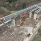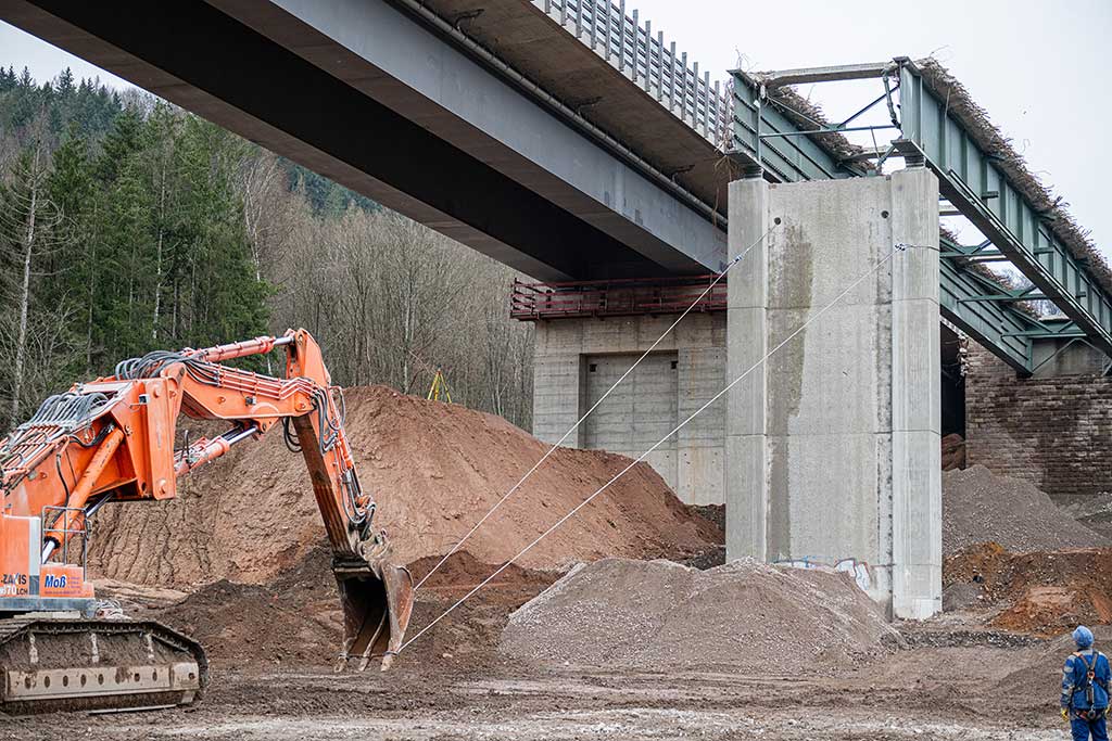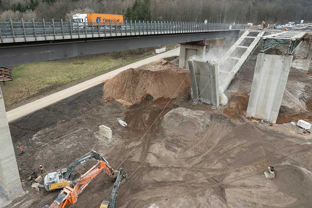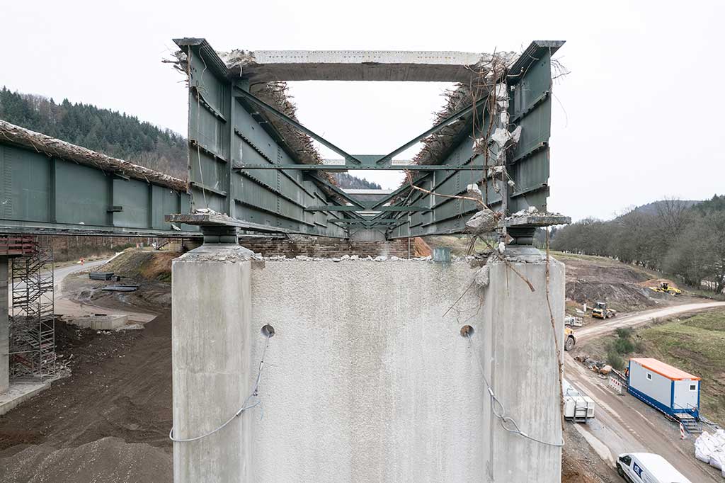 Seit die Fahrbahnplatten aus Beton von den der Unterkonstruktion entfernt sind geht es mit dem Rückbau der Unterkonstruktion und den Pfeilern der Grumbachtalbrücke zügig voran.