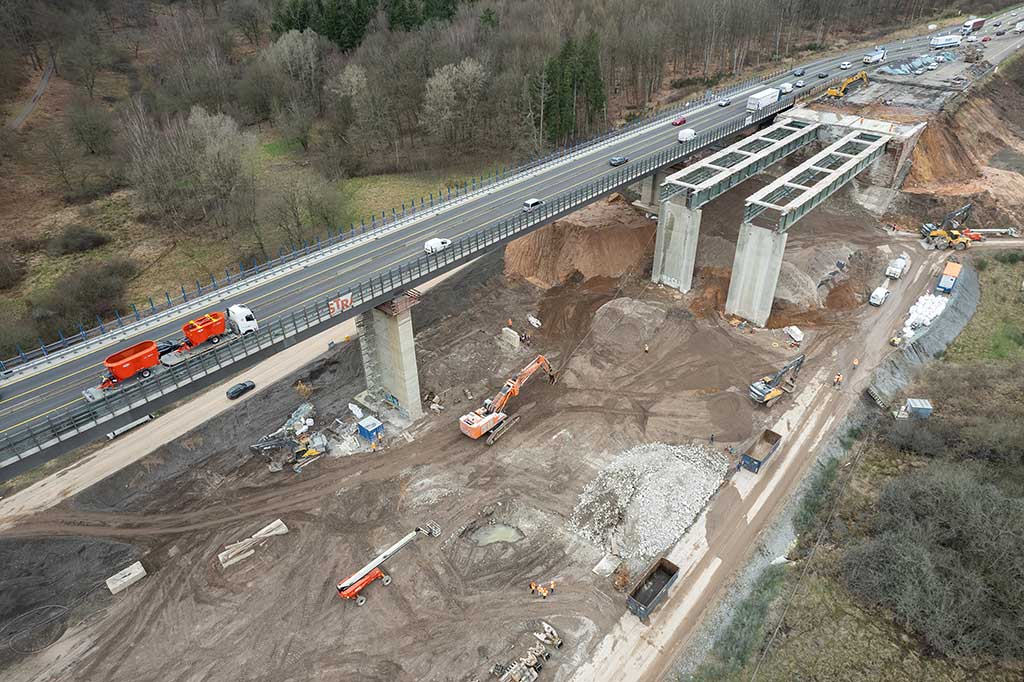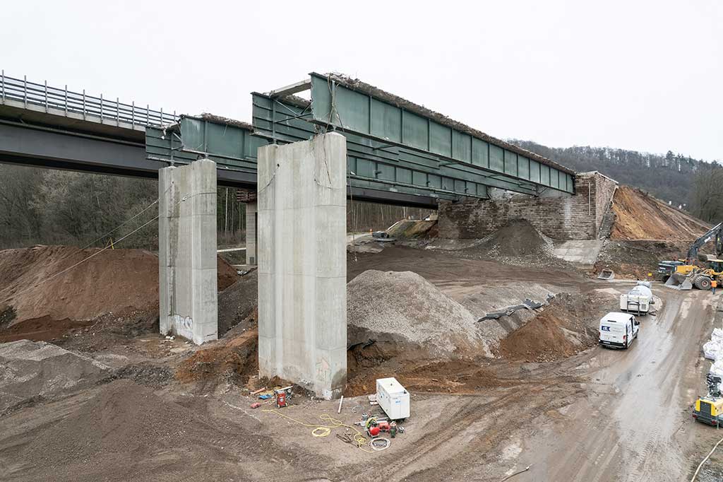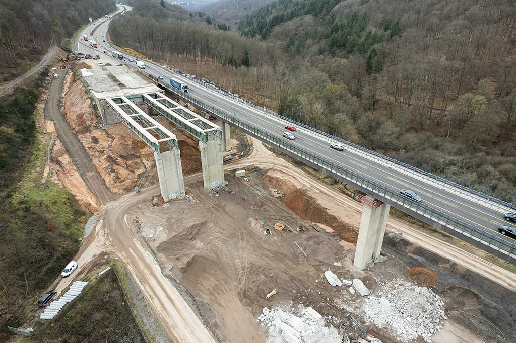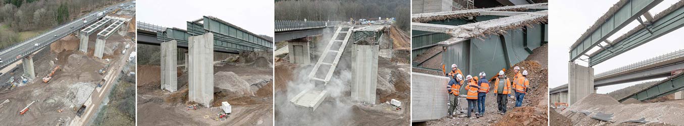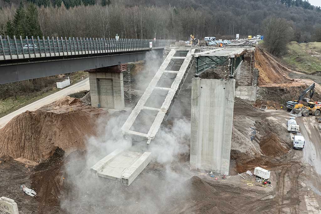Pfeiler und Träger werden nun in transportable Stücke zerlegt, nach Gestein- und Metallanteilen getrennt und können wiederverwertet werden. Auf der geräumten Fläche werden zeitnah die Stützpfeiler für das Teilbauwerks mit Fahrbahnplatte in Richtung Saarbrücken errichtet. Sobald die neuen Pfeiler fertig gestellt sind, wird der komplette Überbau in seine endgültige Position verschoben.