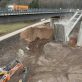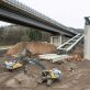 In den vorangehenden Wochen wurden die stählernen Brückenlängsträger der drei inneren Brückenfeldern entfernt und die stützenden Pfeiler zerlegt, am gestrigen Mittwoch wurden die beiden äußeren Pfeiler zusammen mit den aufliegenden Endfeldern umgezogen.