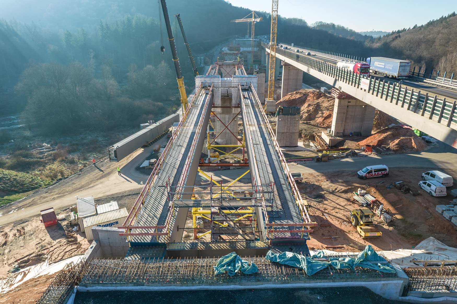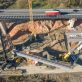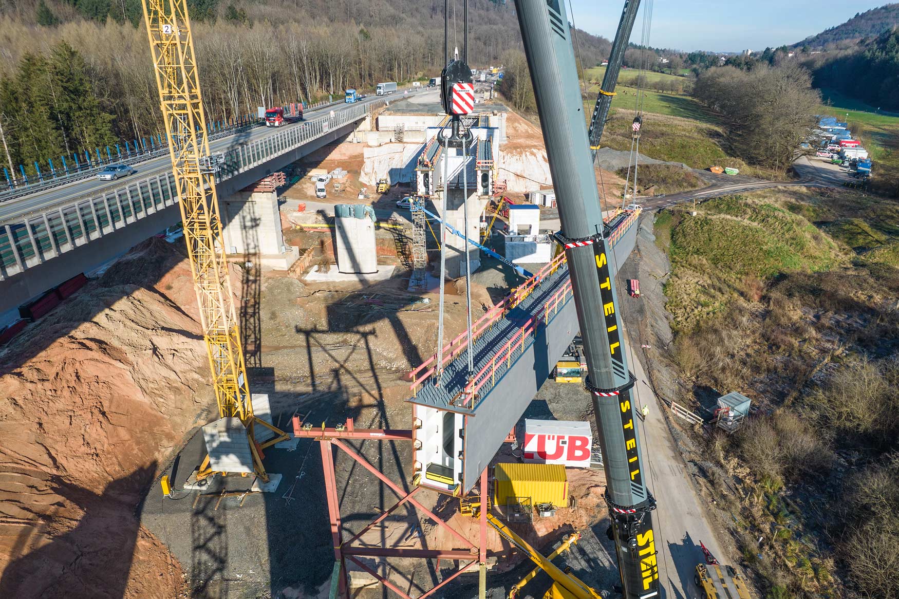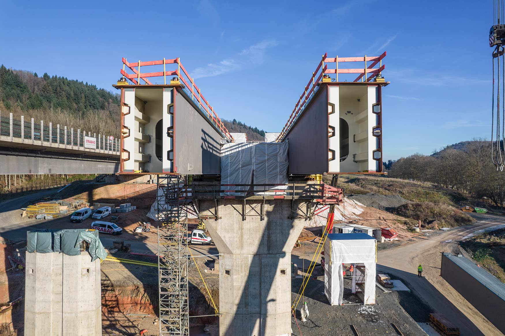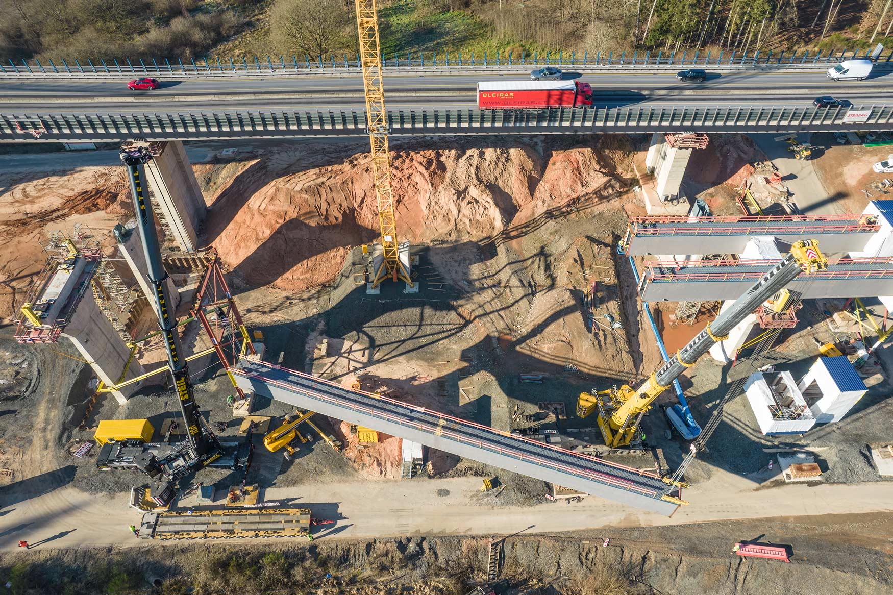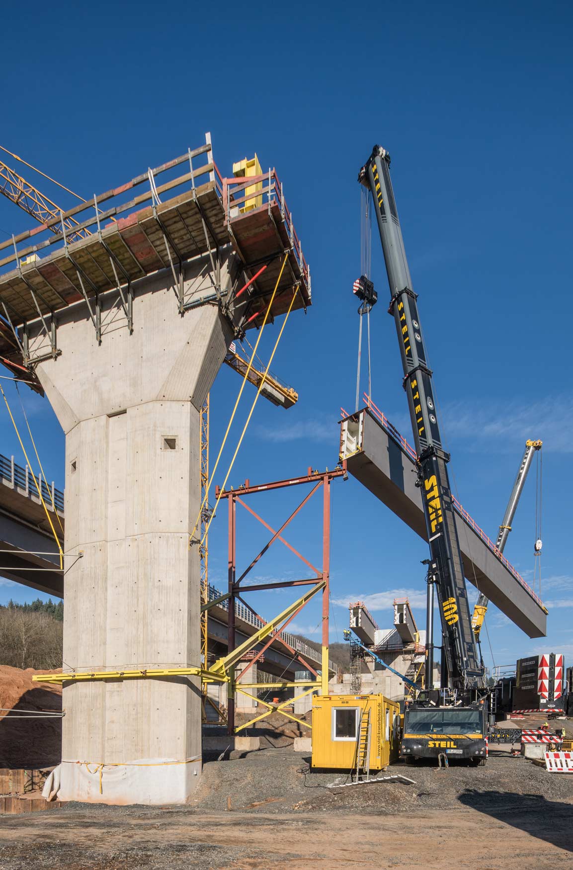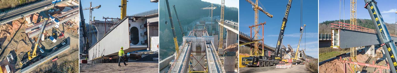 Nachdem im Januar letzten Jahres das Bestandsbauwerk zurückgebaut worden ist, wurden anschließend die neuen Stützpfeiler errichtet. Seit Mitte Januar werden nun die Hohlkästen für die Längsträger des Ersatzneubaus in Teilstücken eingehoben.