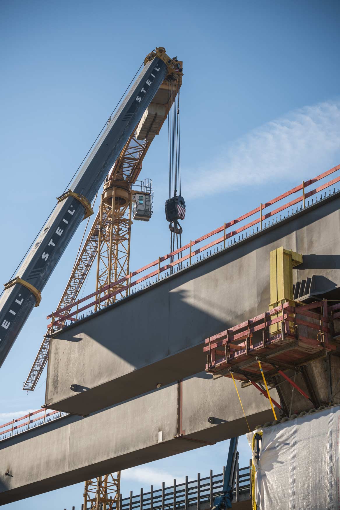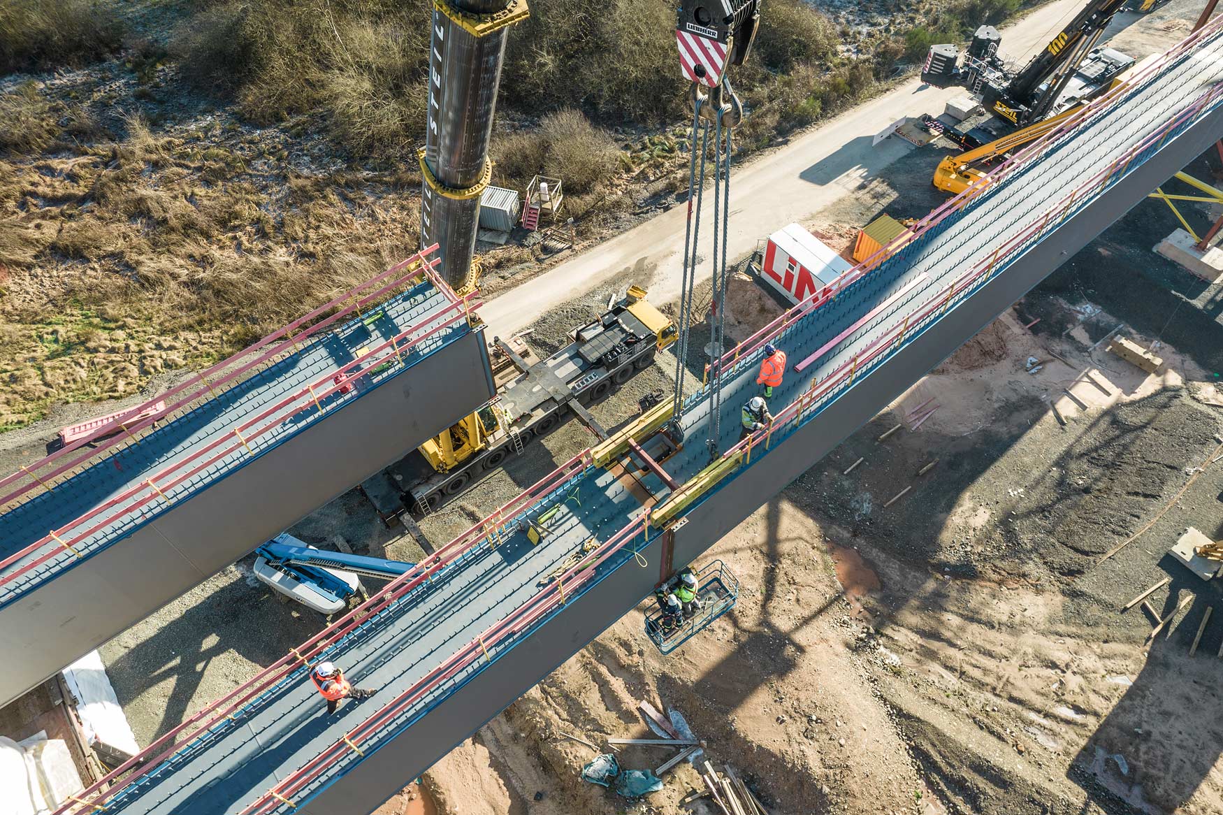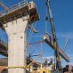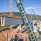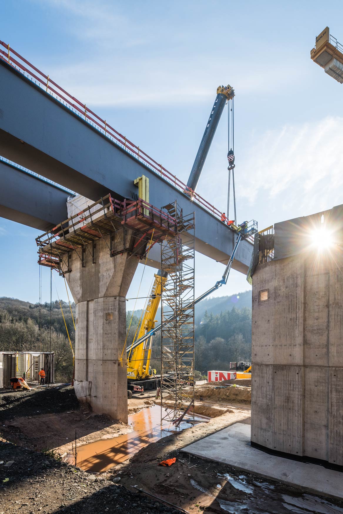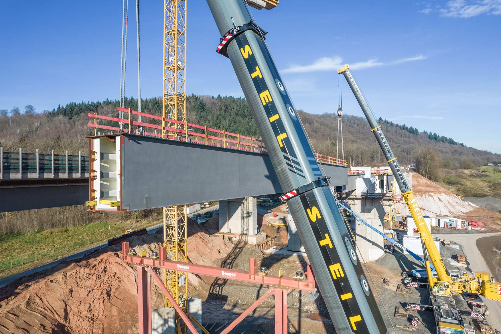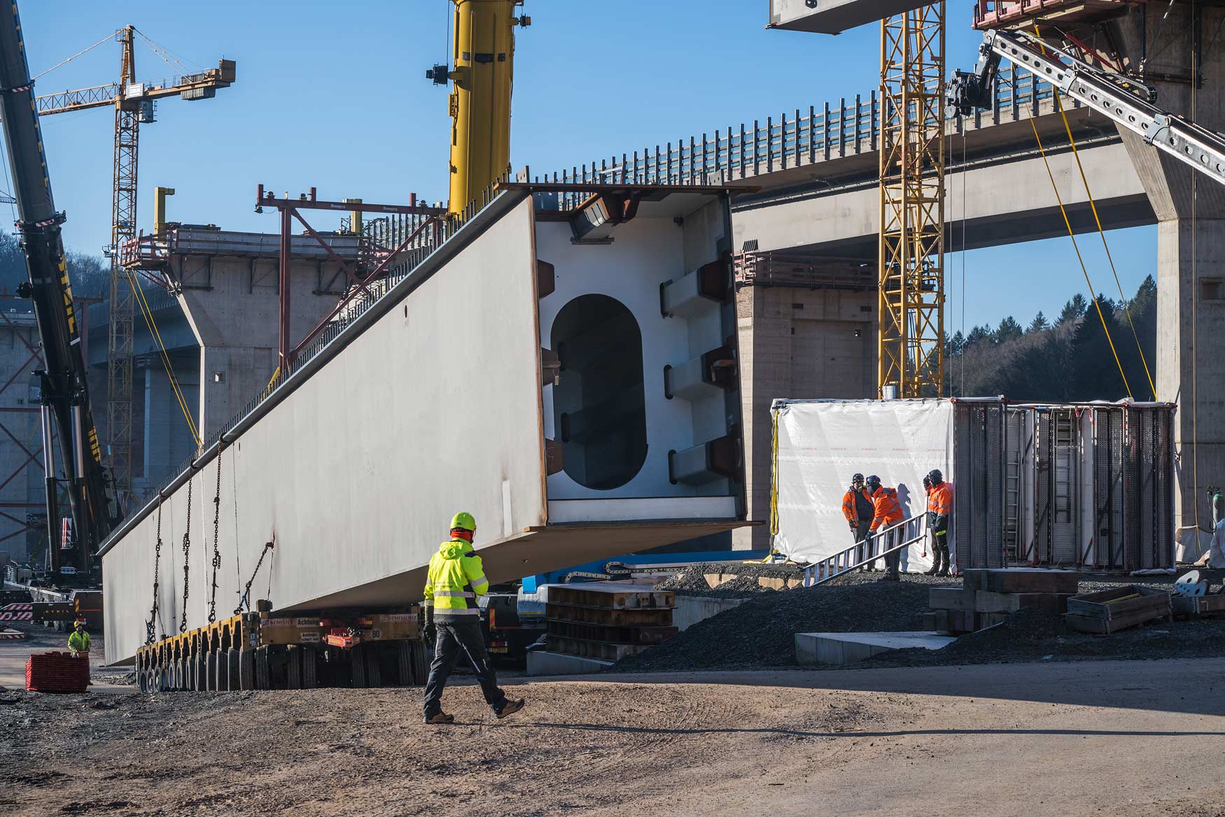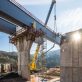 Nachdem im Januar letzten Jahres das Bestandsbauwerk zurückgebaut worden ist, wurden anschließend die neuen Stützpfeiler errichtet. Seit Mitte Januar werden nun die Hohlkästen für die Längsträger des Ersatzneubaus in Teilstücken eingehoben.