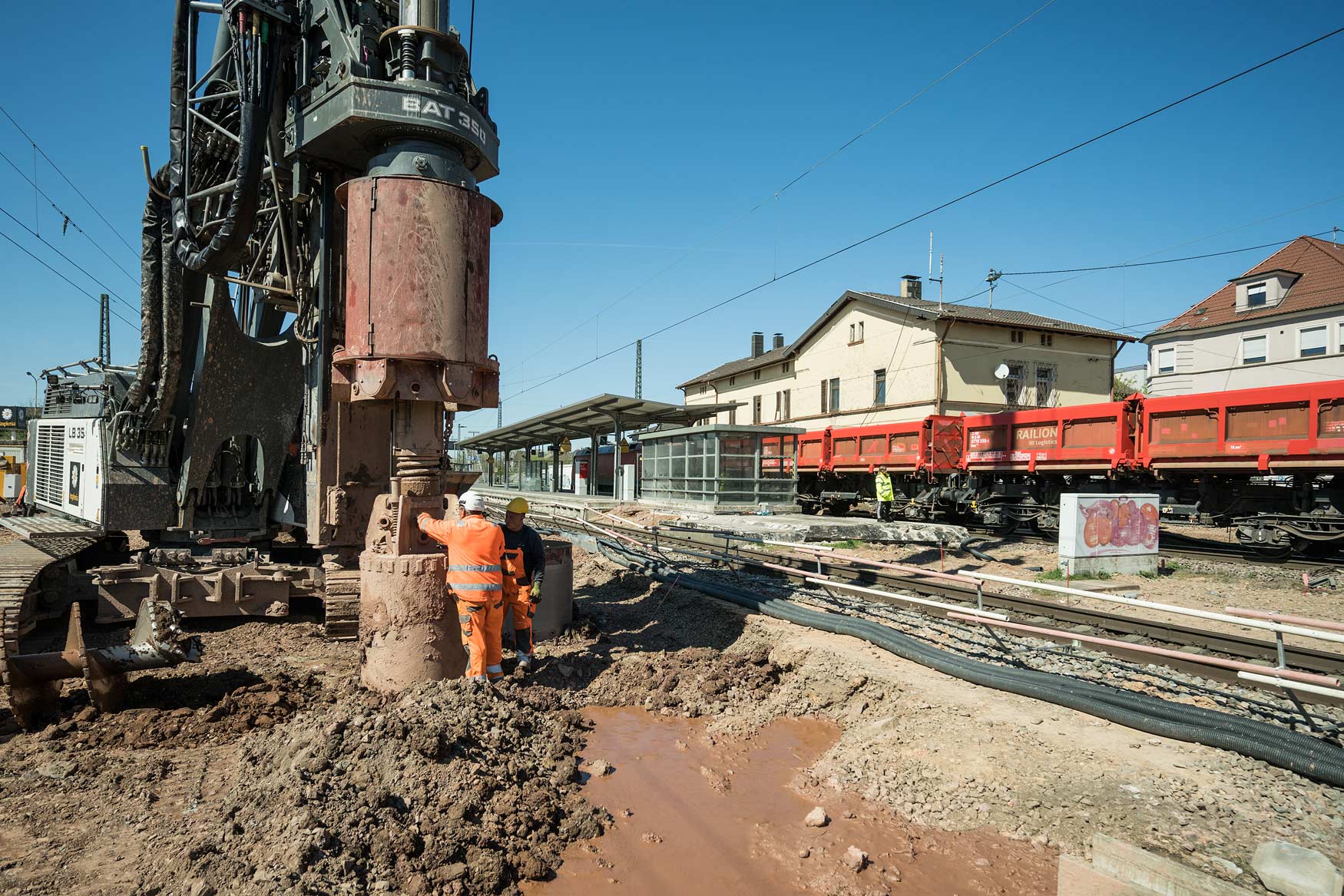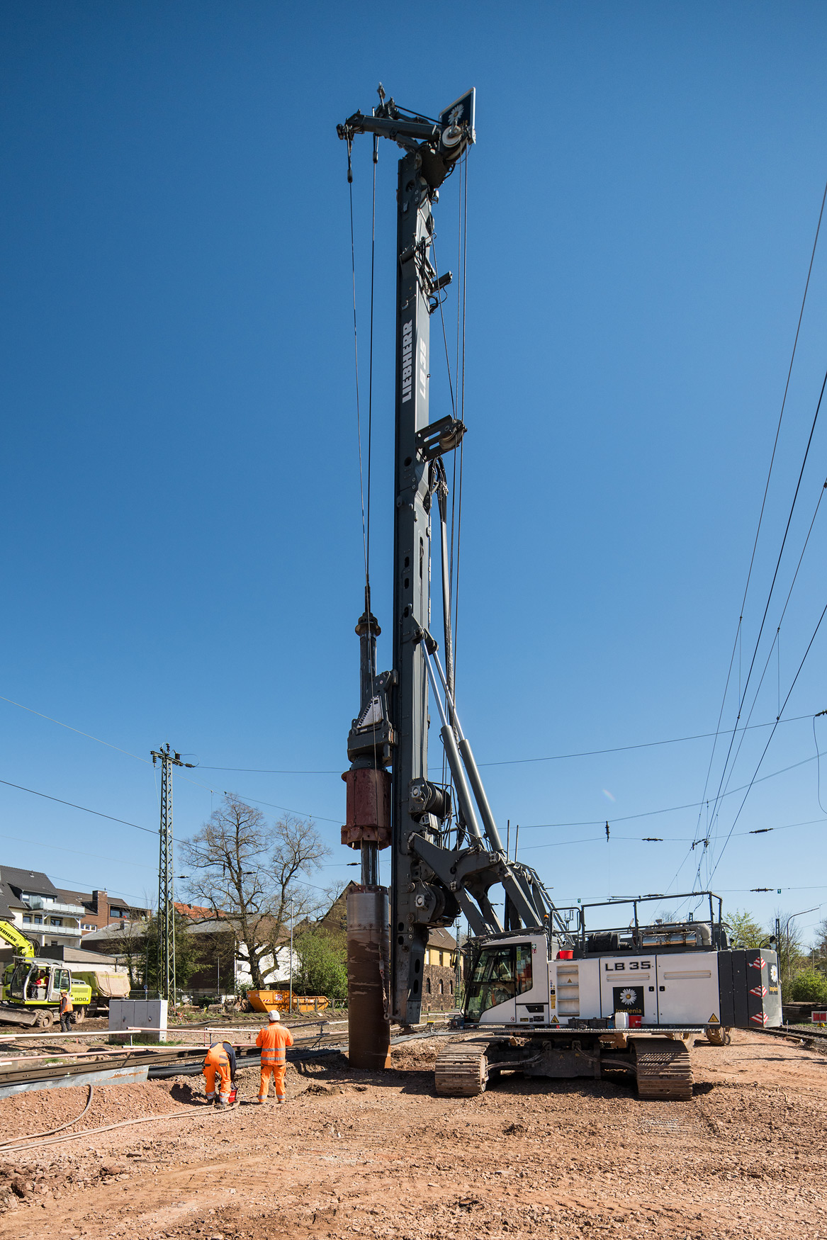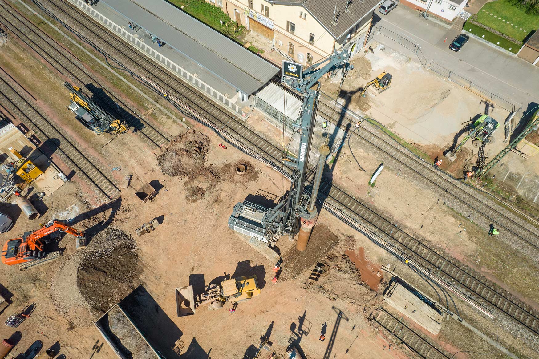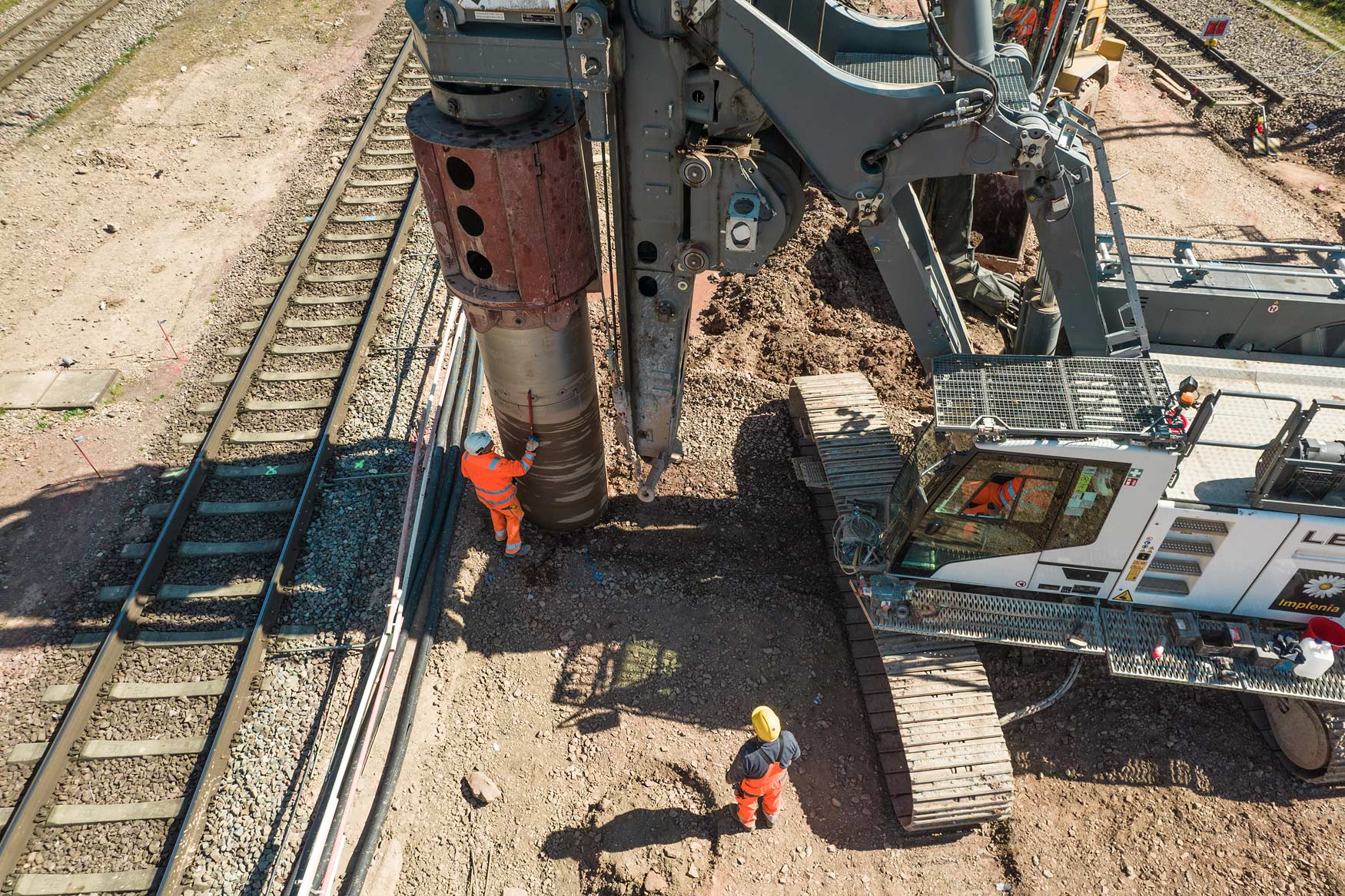 Die Baugrube für die neue Unterführung wird mit rückverankerten Spundbohlen gesichert. Um diese sicher einbringen zu können, sind rund 235 Austauschbohrungen notwendig, um den Untergrund für die Arbeiten vorzubereiten.