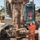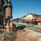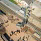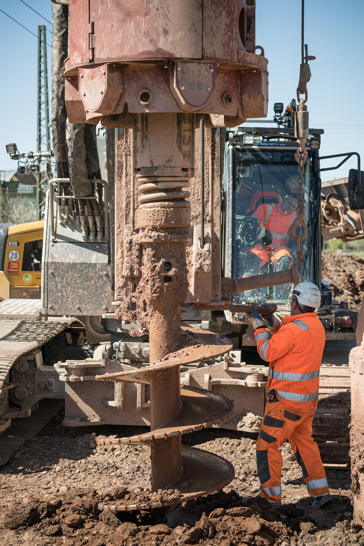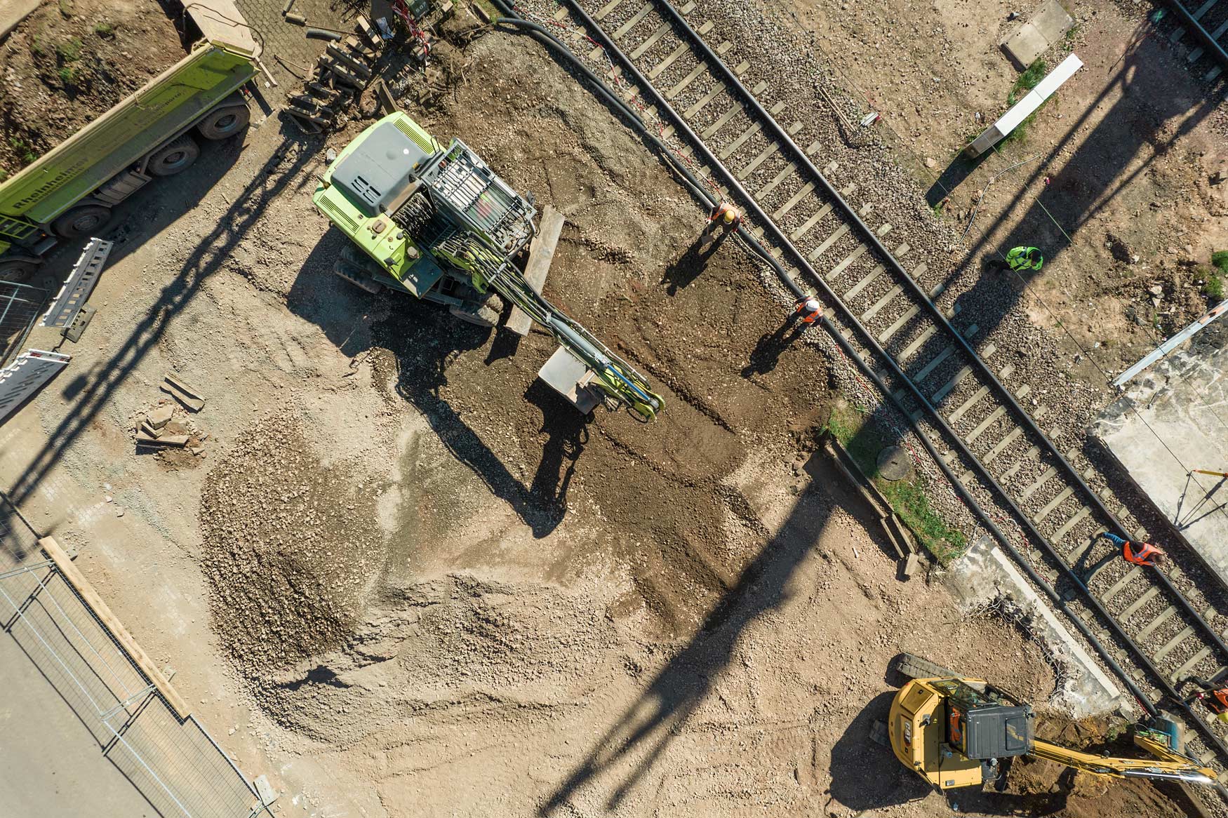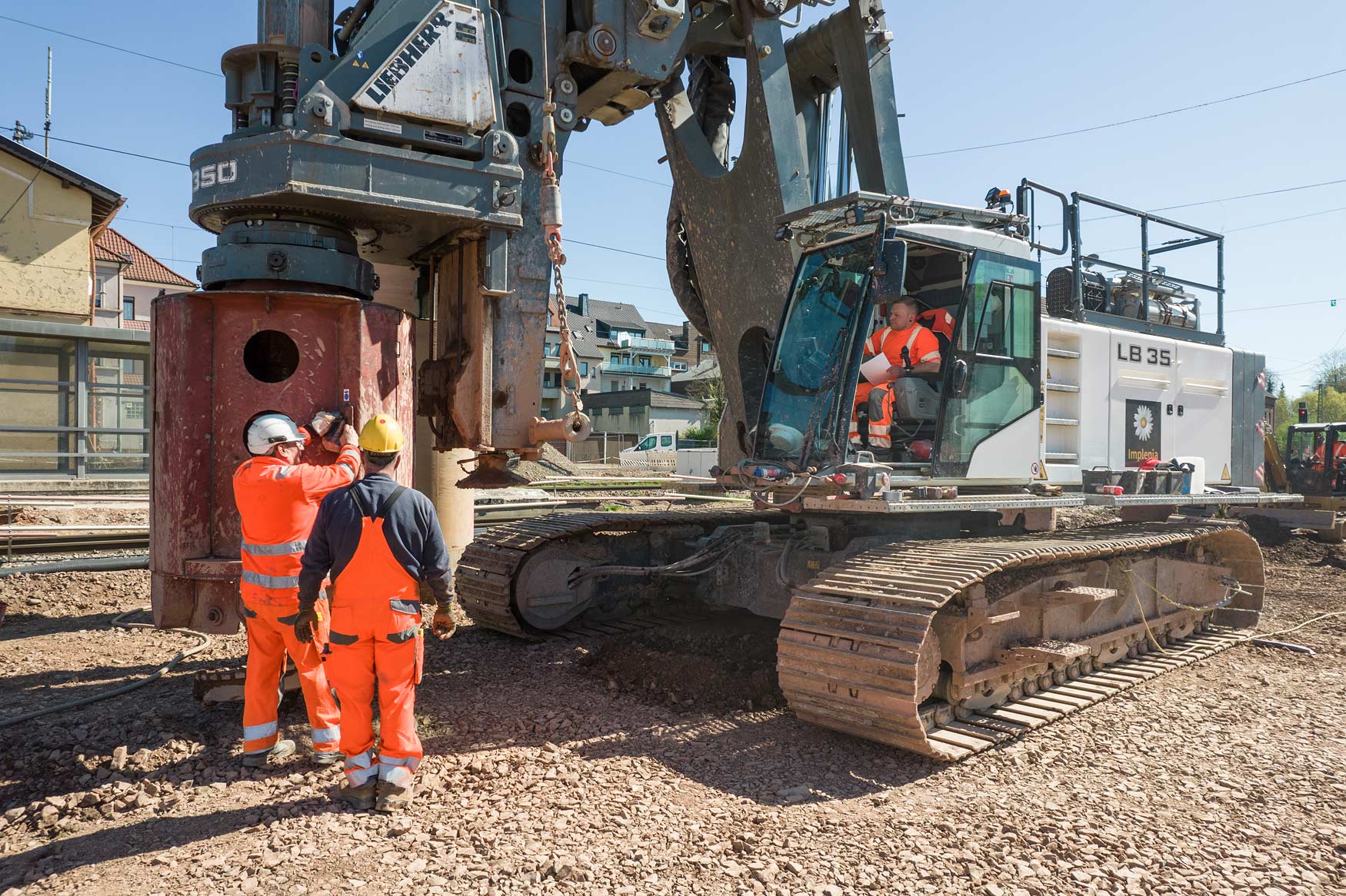 Die Baugrube für die neue Unterführung wird mit rückverankerten Spundbohlen gesichert. Um diese sicher einbringen zu können, sind rund 235 Austauschbohrungen notwendig, um den Untergrund für die Arbeiten vorzubereiten.