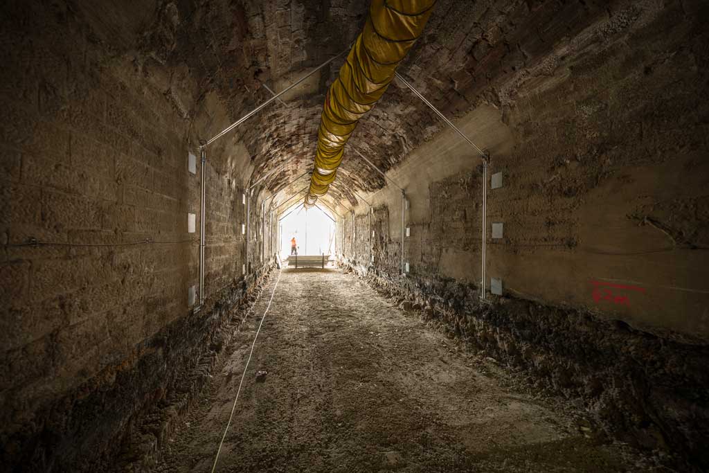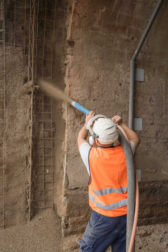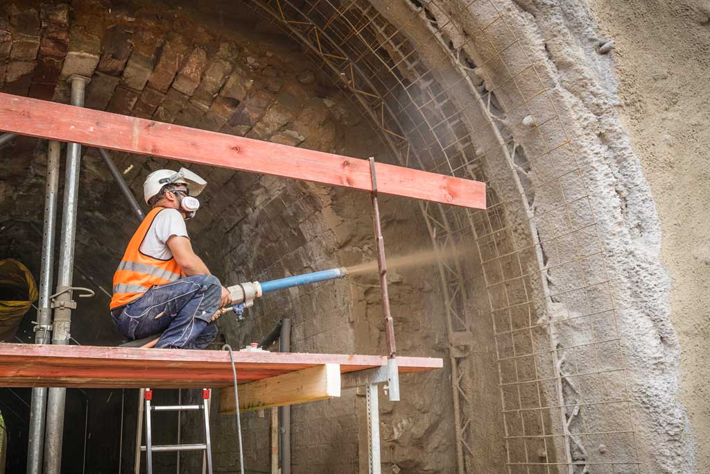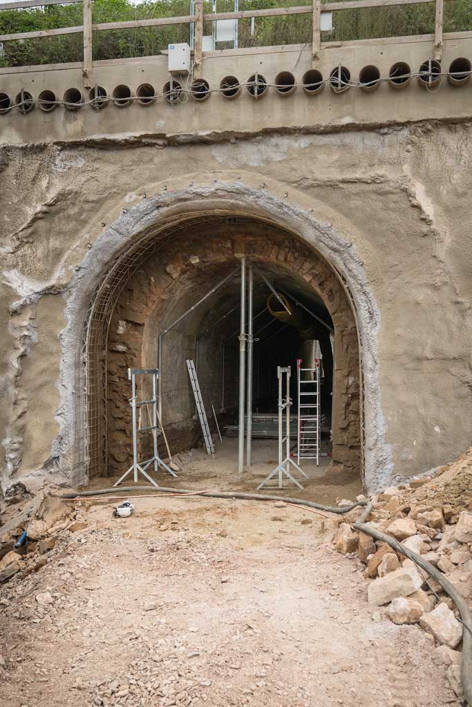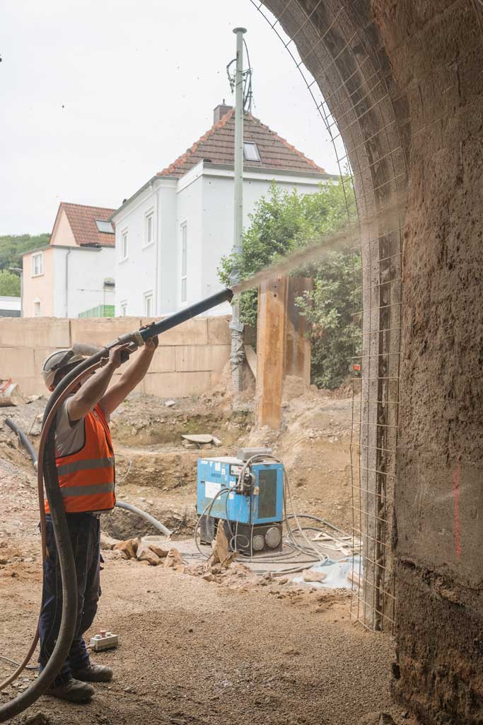 Der Rohrschirm übernimmt die Lasten des Bahndammes in der Ausbruchsphase zwischen Rückbau und Herstellung der bewehrte Spritzbetonschale. Diese Spritzbetonschale sichert den Teilabbruch, der in kleinen Abschnitten von 0,8 m bis 1,5 m erfolgt. Sobald das Gewölbe über die gesamte Länge gesichert ist, können die Stahlbetoninnen und -außenschale aus Ortbeton hergestellt werden.