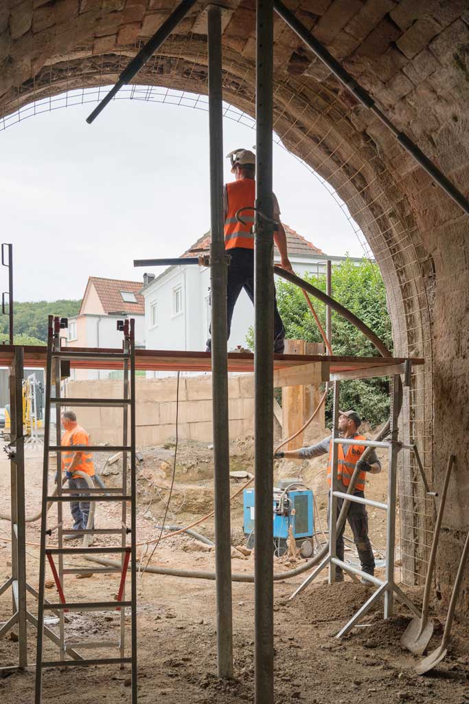 Um den Teilabbruch des Bestandsbauwerks zu realisieren, musste im Vorfeld ein horizontaler Rohrschirm oberhalb des bestehenden Gewölbes eingebohrt werden. Dieser dient zur Minimierung der Setzungen im Gleisbereich Dieser ist leicht nach oben geneigt, die Rohre sind alle horizontal nebeneinander angeordnet.
