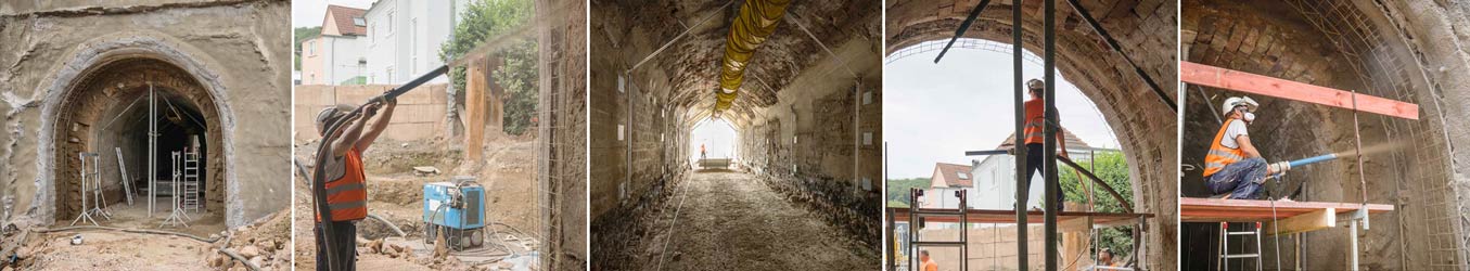 Die Erneuerung des Bauwerks erfolgt im Tunnelbauverfahren. Hier wird eine geschlossene Bauweise im Untertagebau angewandt. Hierzu wird der gemauerte Bestandstunnel durch eine bewehrte Spritzbetonaußenschale sowie eine Stahlbetoninnenschale ersetzt. Vor Beginn der eigentlichen Tunnelbauarbeiten musste eine Baufeldfreiheit geschaffen werden, indem bestehende Gas,-Strom-, Wasser-, und Abwasserleitungen sowie Telekommunikationsleitungen umverlegt wurden. Hierzu musste eine provisorische Medientrasse hergestellt werden und der Bahndamm im Press-Bohr-Verfahren DN 1000 unterquert werden.