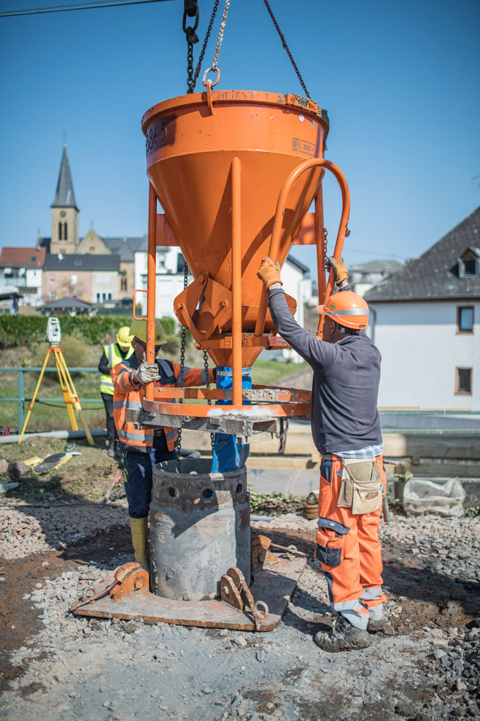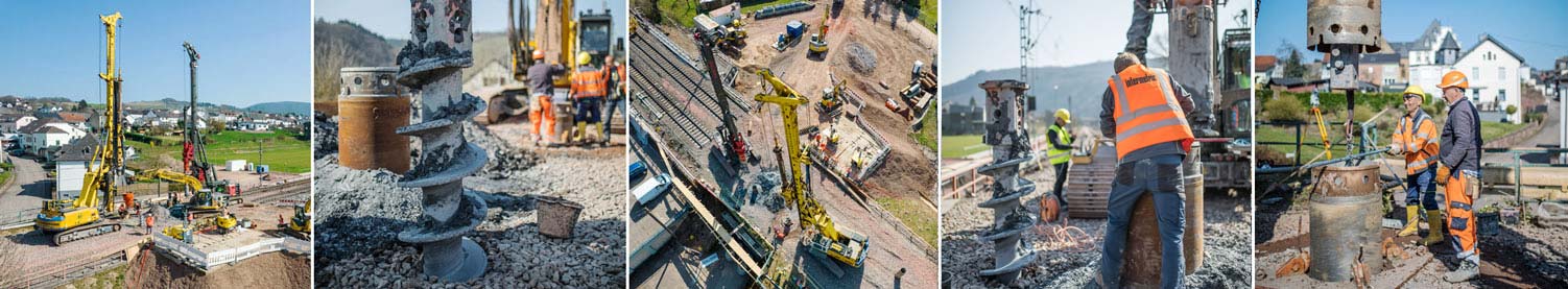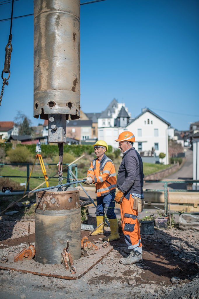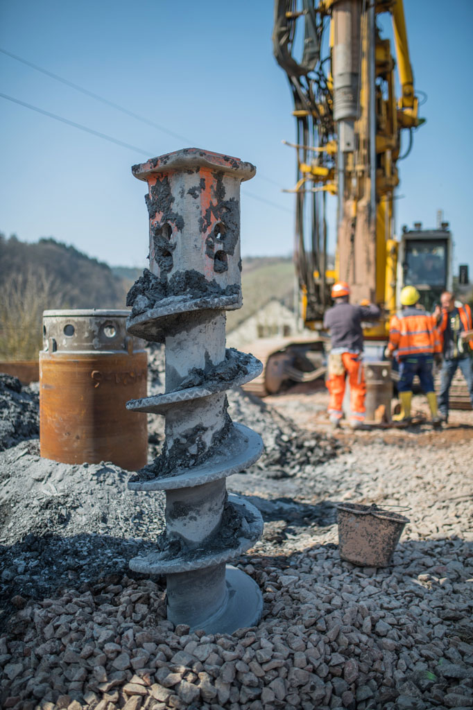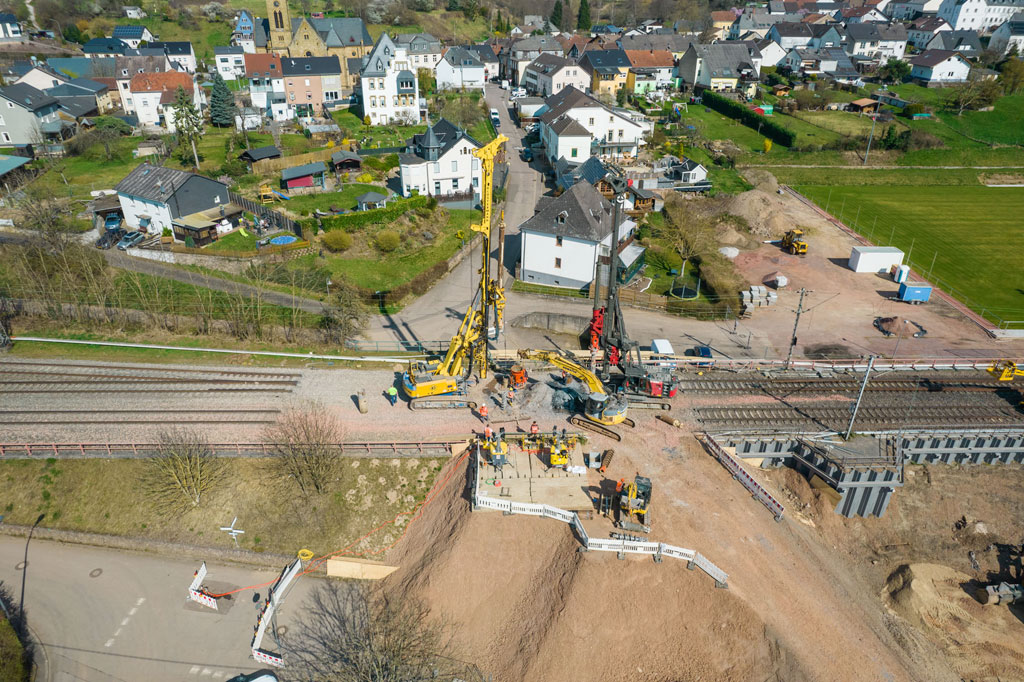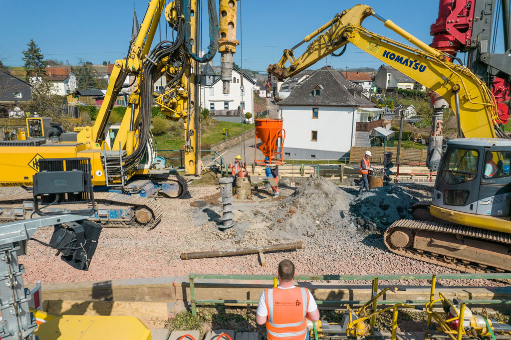 Am vergangenen Wochenende wurden bei der Erneuerung der vorhandenen Eisenbahnüberführung der Bahnhofstraße in Serrig im Landkreis Trier-Saarburg insgesamt vier Bohrpfähle hergestellt. Bereits eine Woche zuvor wurden hier zwölf Zertrümmerungsbohrungen mit einer Tiefe von fünf bis sechs Metern durchgeführt. Die neuen Bohrungen haben eine Tiefe von etwa 15 bis 16 Metern ab Oberkante Arbeitsfläche.