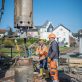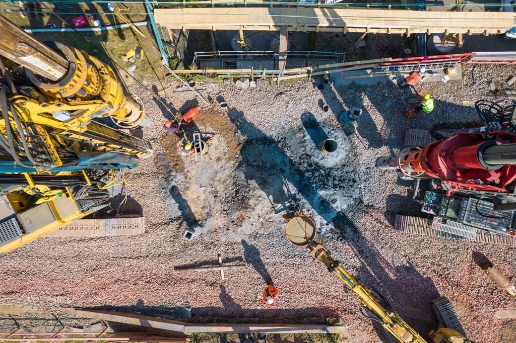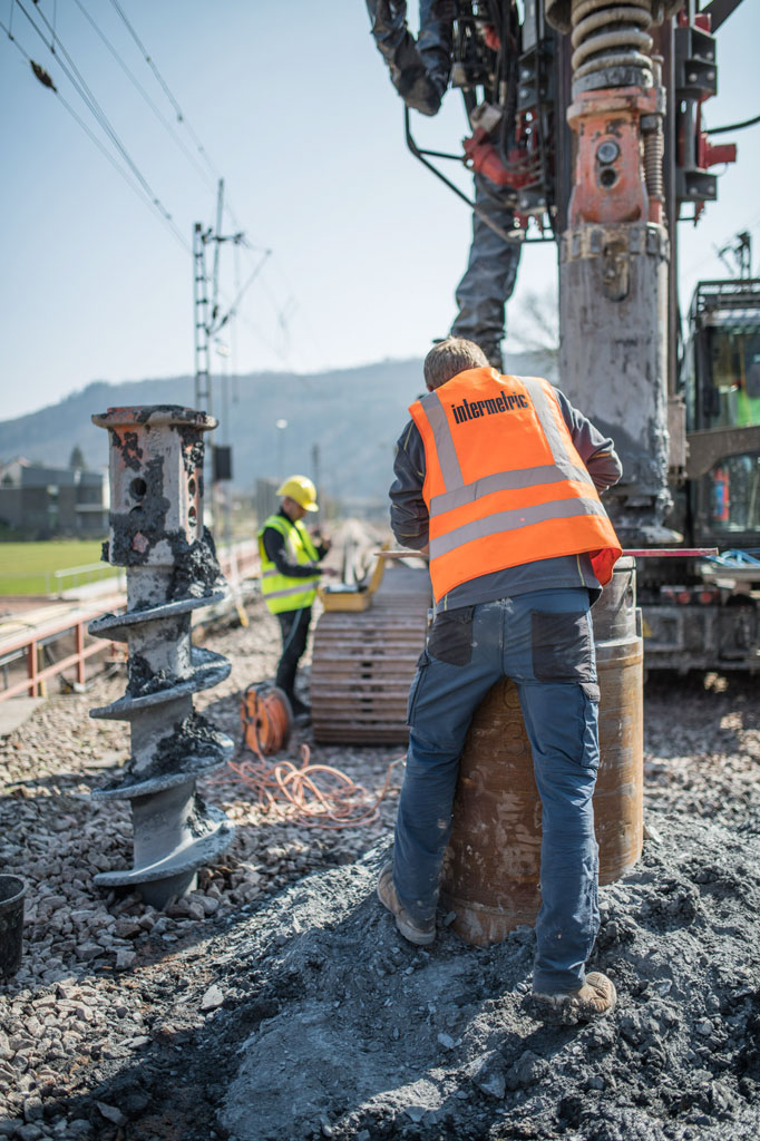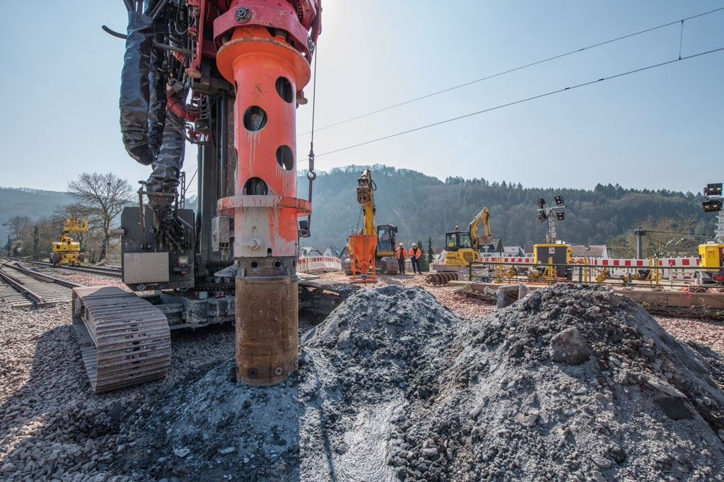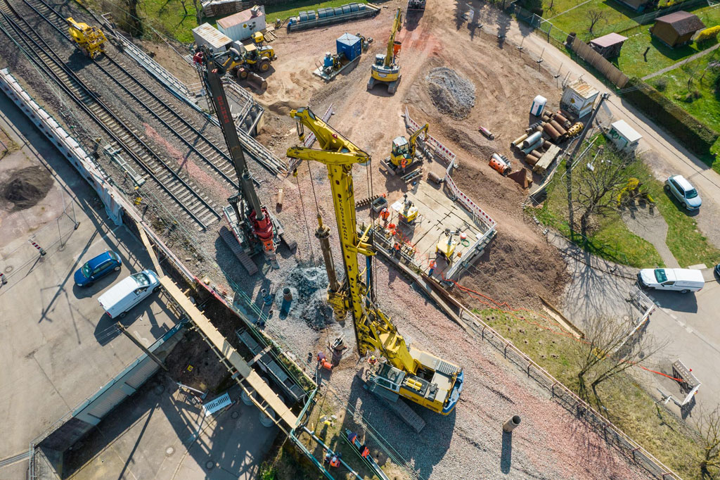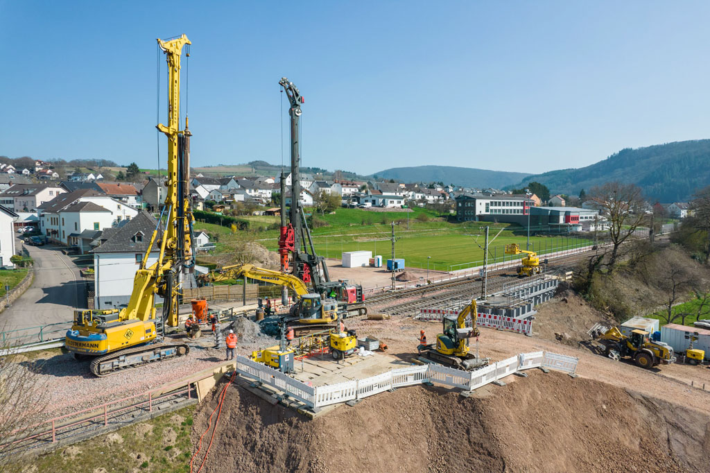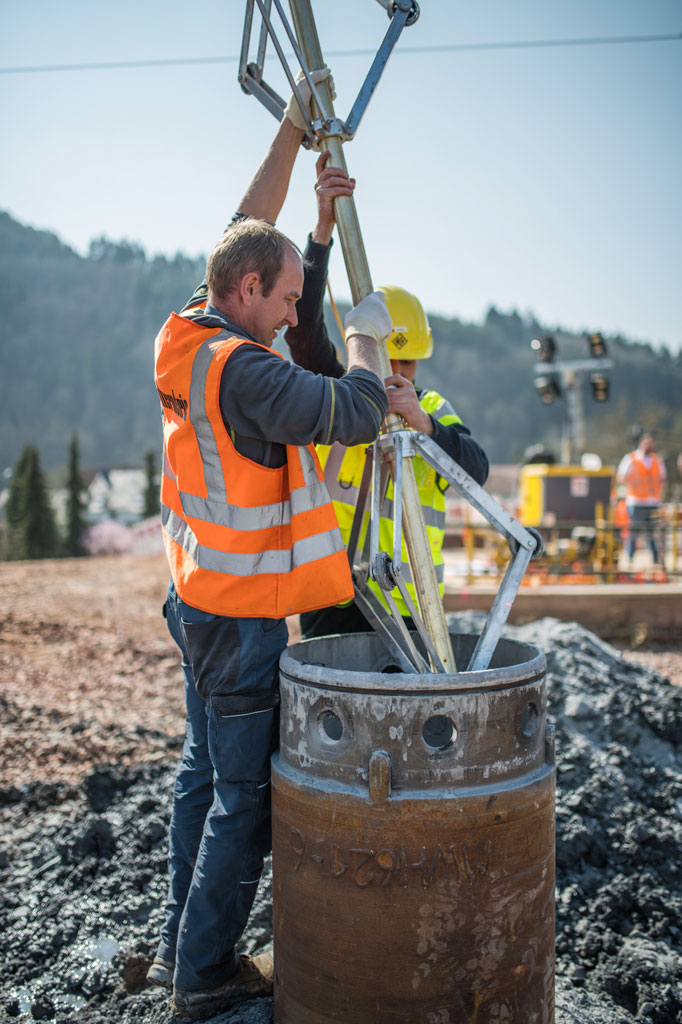 Am vergangenen Wochenende wurden bei der Erneuerung der vorhandenen Eisenbahnüberführung der Bahnhofstraße in Serrig im Landkreis Trier-Saarburg insgesamt vier Bohrpfähle hergestellt. Bereits eine Woche zuvor wurden hier zwölf Zertrümmerungsbohrungen mit einer Tiefe von fünf bis sechs Metern durchgeführt. Die neuen Bohrungen haben eine Tiefe von etwa 15 bis 16 Metern ab Oberkante Arbeitsfläche.
