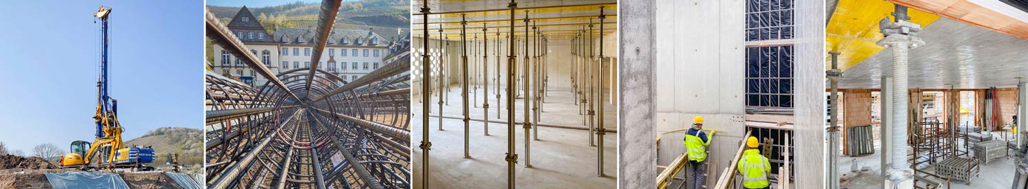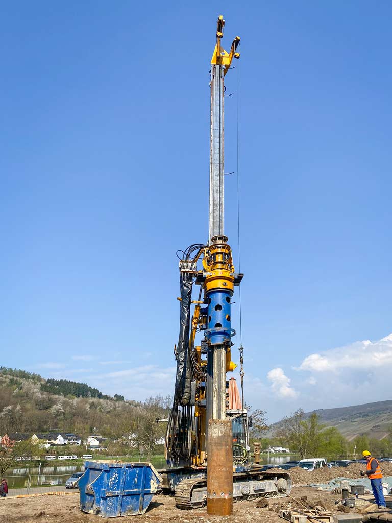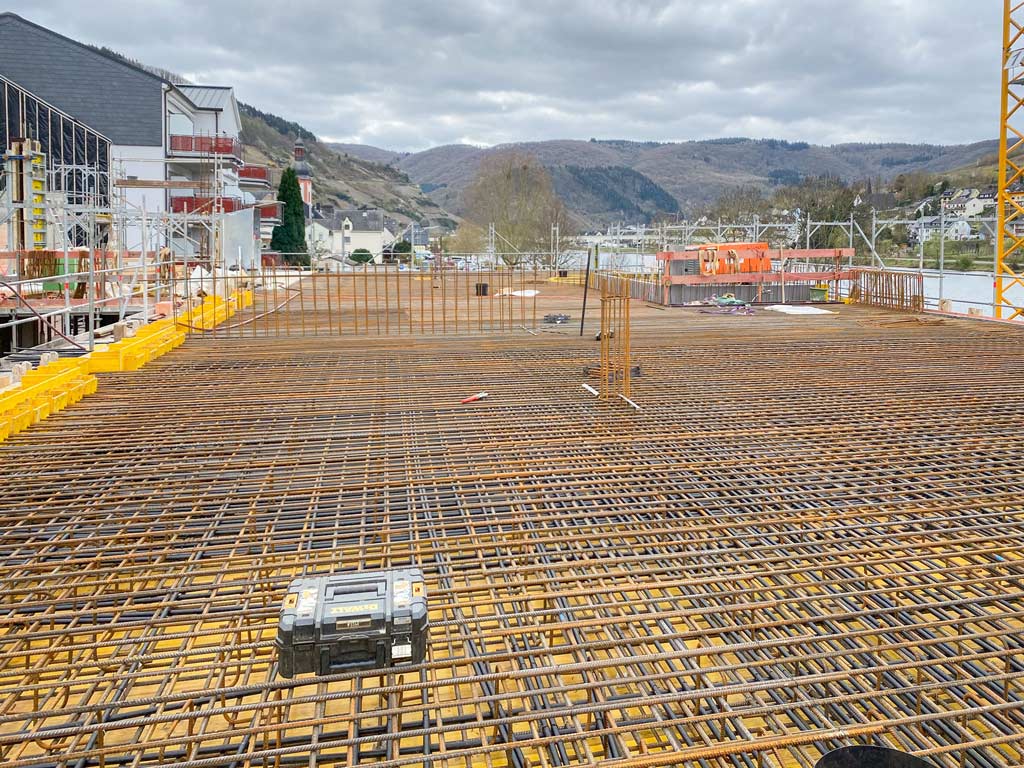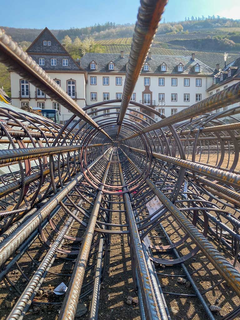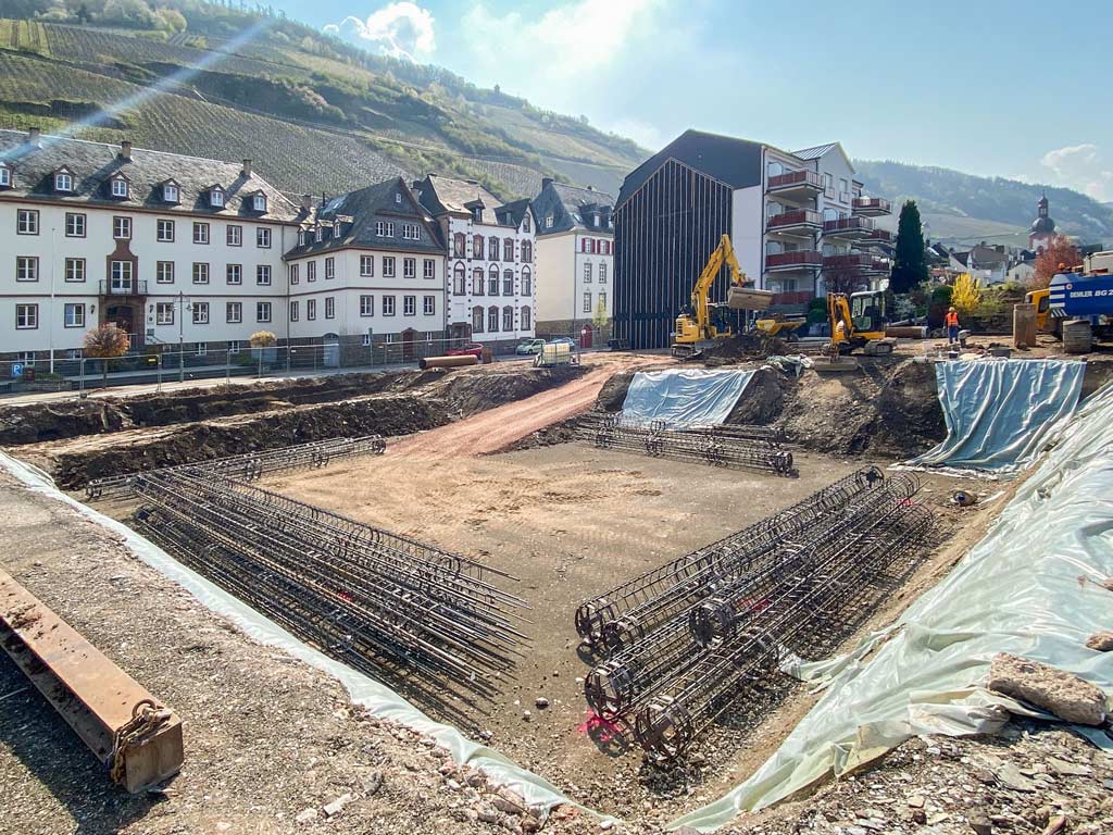 Die Verbandsgemeinde in Zell an der Mosel gab bereits 2019 die Errichtung eines neuen, dreigeschossigen Verwaltungsgebäudes in zwei Gebäuderiegeln im Überflutungsbereich der Mosel in Auftrag. Der Boden der Tiefgarage liegt in der Wasserwechselzone. Gewünscht wurde daher ein hochgesetztes Erdgeschoss mit Tiefgarage im Untergeschoss als WU Konstruktion.