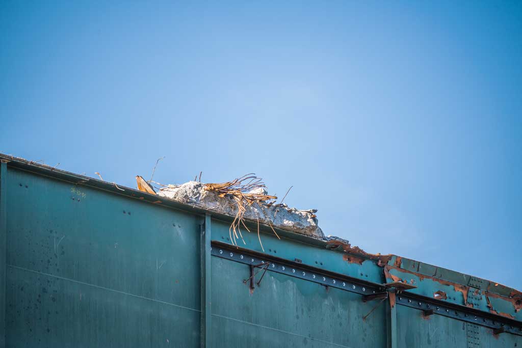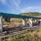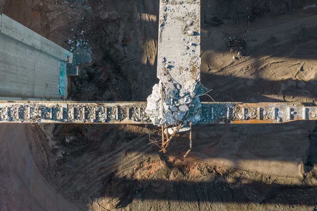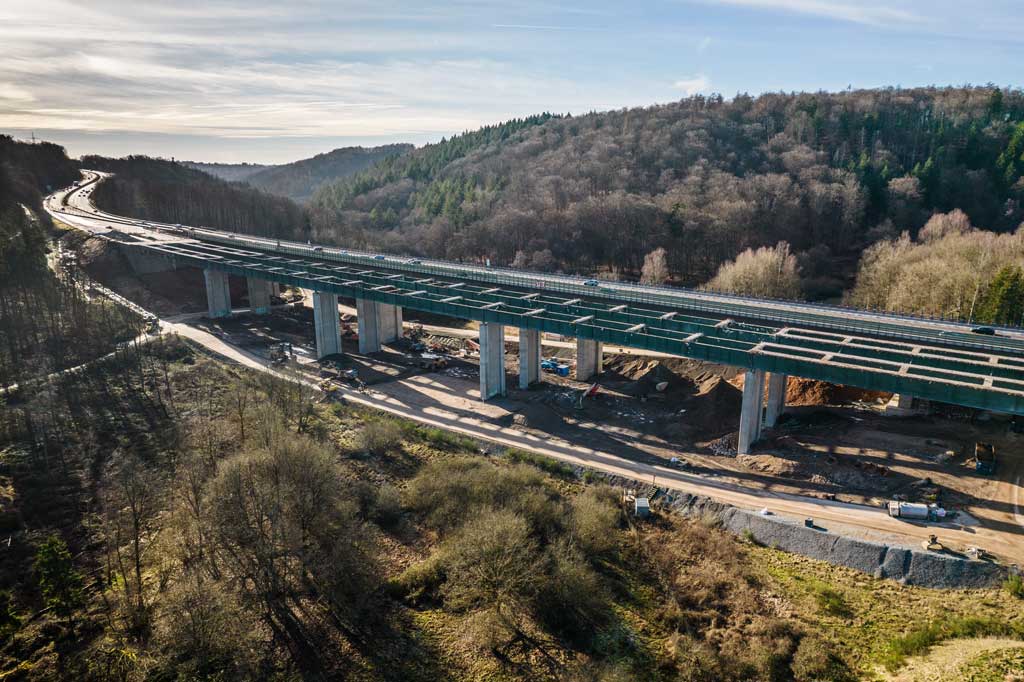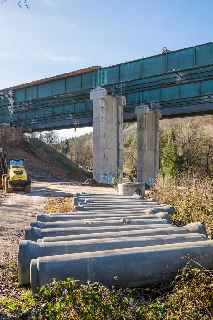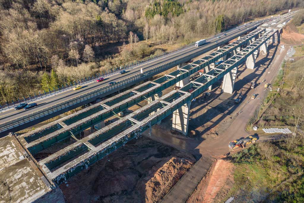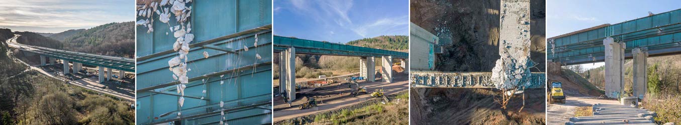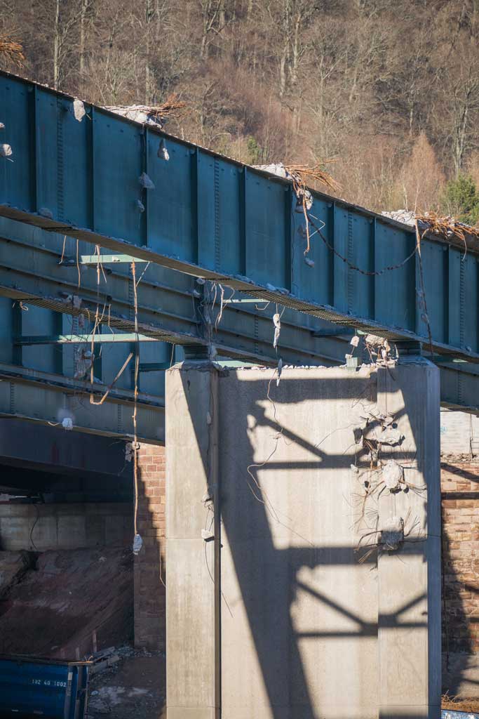 Nachdem das provisorische Bauwerk auf der Westseite der Grumbachtalbrücke fertiggestellt und für den Verkehr freigegeben wurde, konnte der Rückbau der alten Brücke beginnen. Inzwischen sind die beiden Fahrbahnplatten aus Beton bis auf kleine Reststücke so weit entfernt, dass demnächst die Unterkonstruktion aus Stahl und die Betonpfeiler rückgebaut werden können.