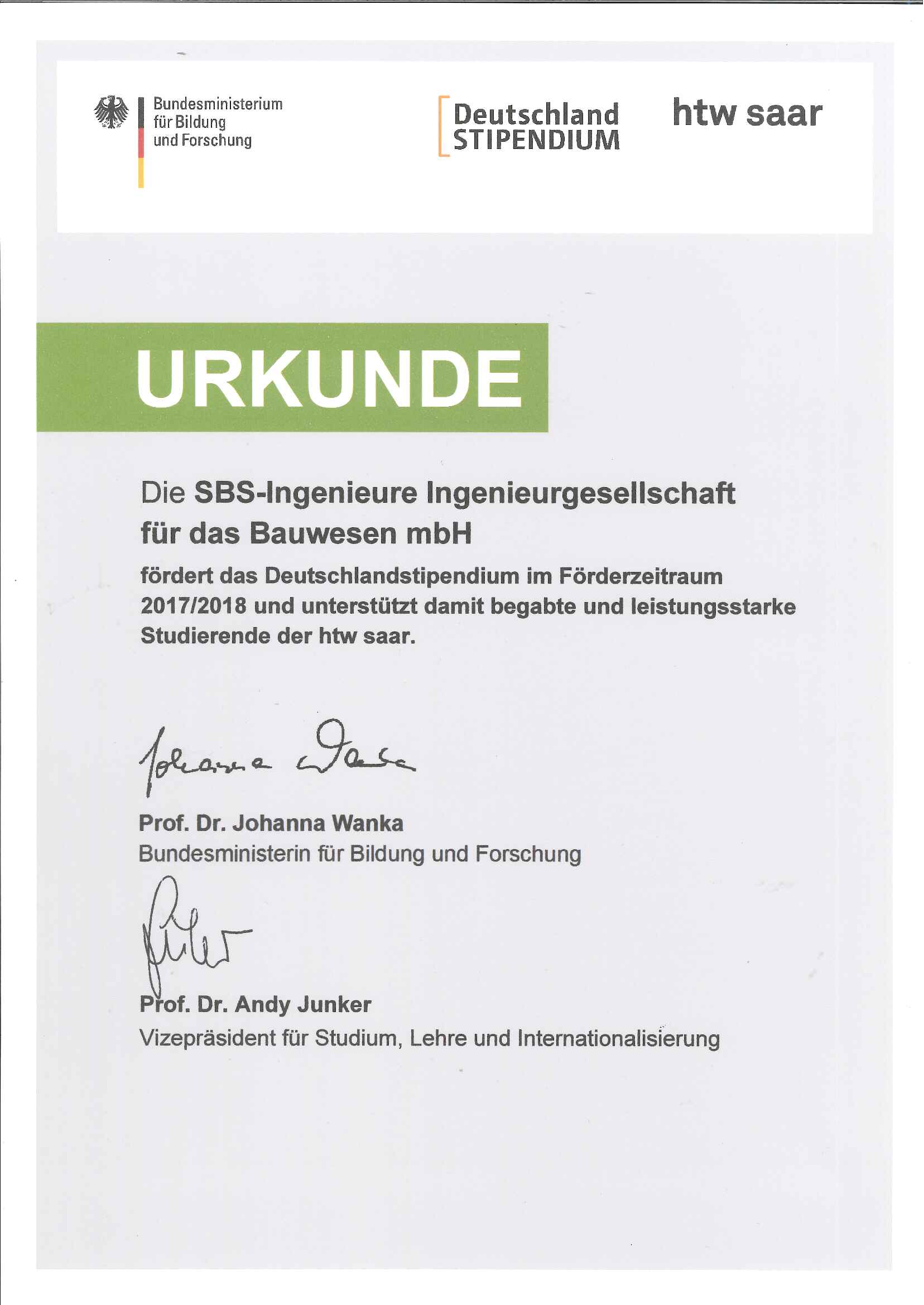 Die SBS-Ingenieure sind seit 2017 neuer Förderer an der htw saar mit 2 Deutschlandstipendien. Die Studierenden werden im Rahmen des Stipendiums für 12 Monate mit jeweils 300 €/Monat unterstützt; hinzu kommt eine ideelle Förderung durch die StudienStiftungSaar  und die htw saar in Form von Workshops sowie der Kontakt zum Förderunternehmen.