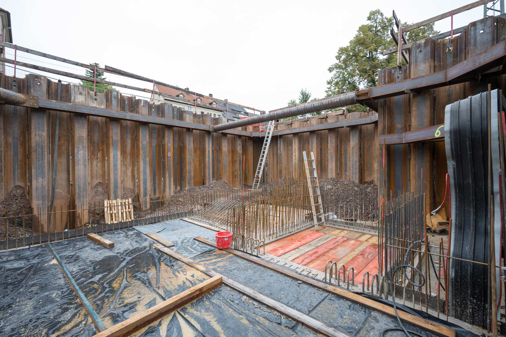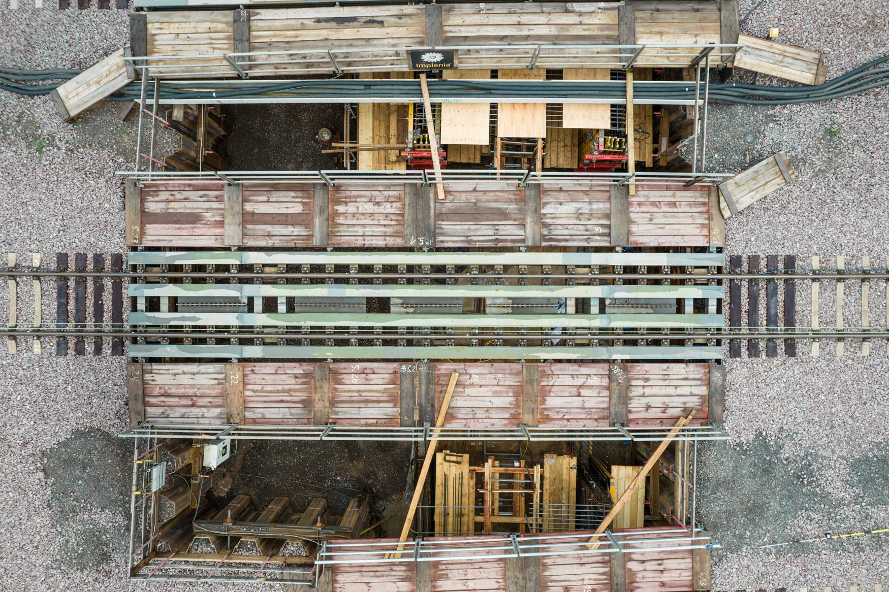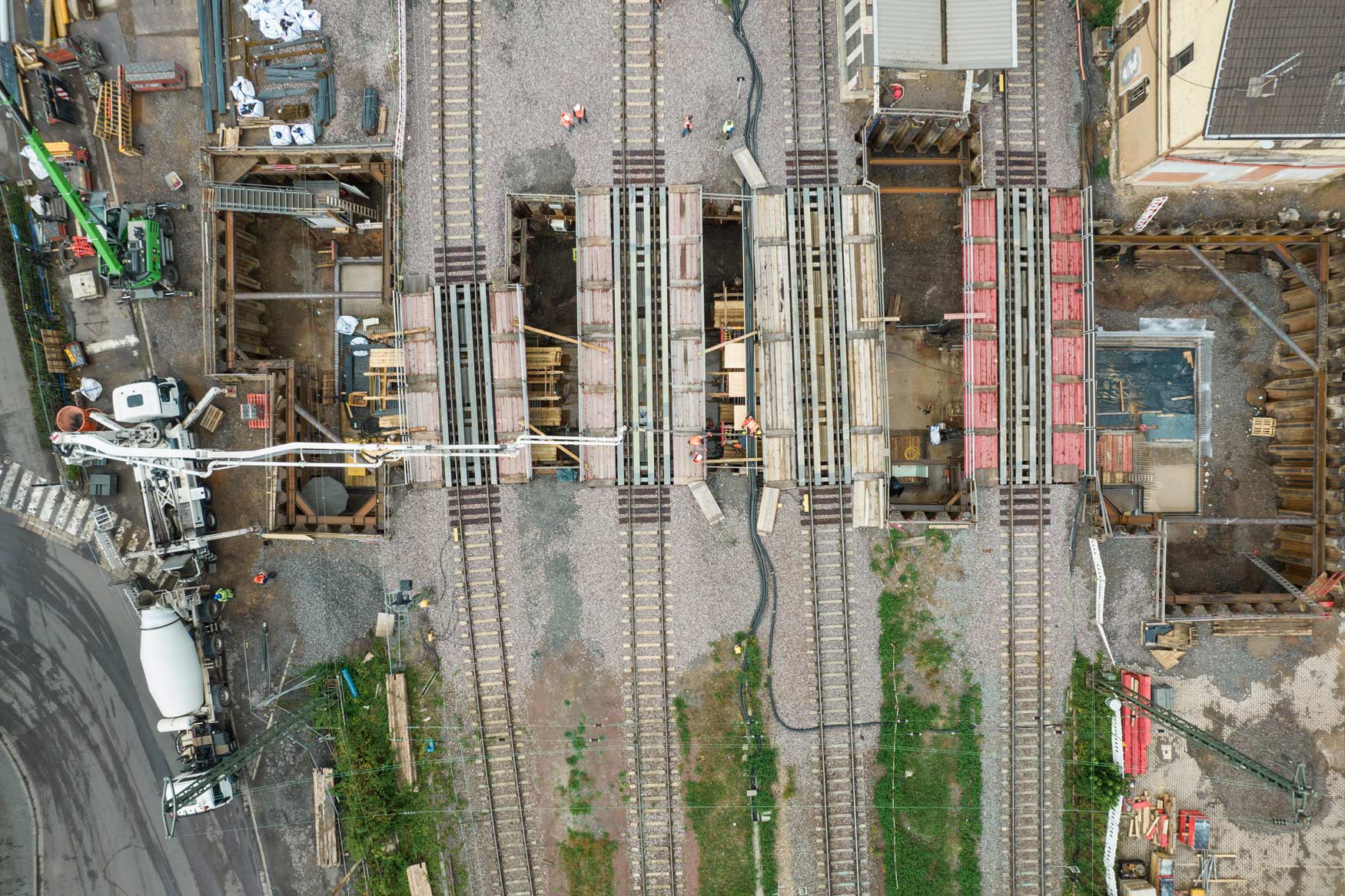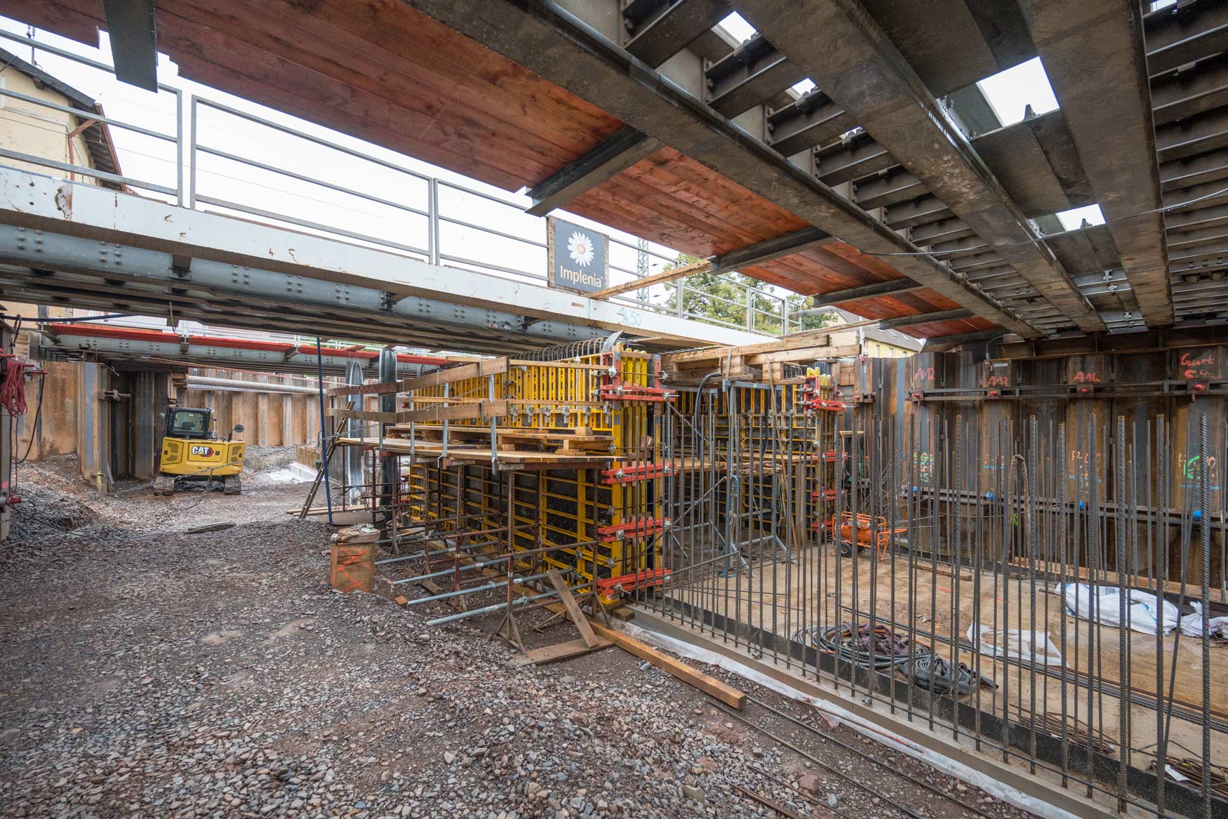 Im nächsten Schritt wurden dann im Rahmen von insgesamt vier genau getakteten Sperrpausen vier Hilfsbrücken eingehoben. Sie stellen sicher, dass der Zugverkehr während der gesamten Bauzeit weitgehend aufrechterhalten werden kann – eine logistische Leistung, die nicht zu unterschätzen ist. Unter diesen provisorischen Brücken wächst nun die neue Unterführung Stück für Stück heran. Die laufenden Beton- und Bewehrungsarbeiten sind dabei eine echte Herausforderung, da die Platzverhältnisse auf der Baustelle äußerst beengt sind und ein hohes Maß an präziser Koordination und durchdachter Planung erfordern.