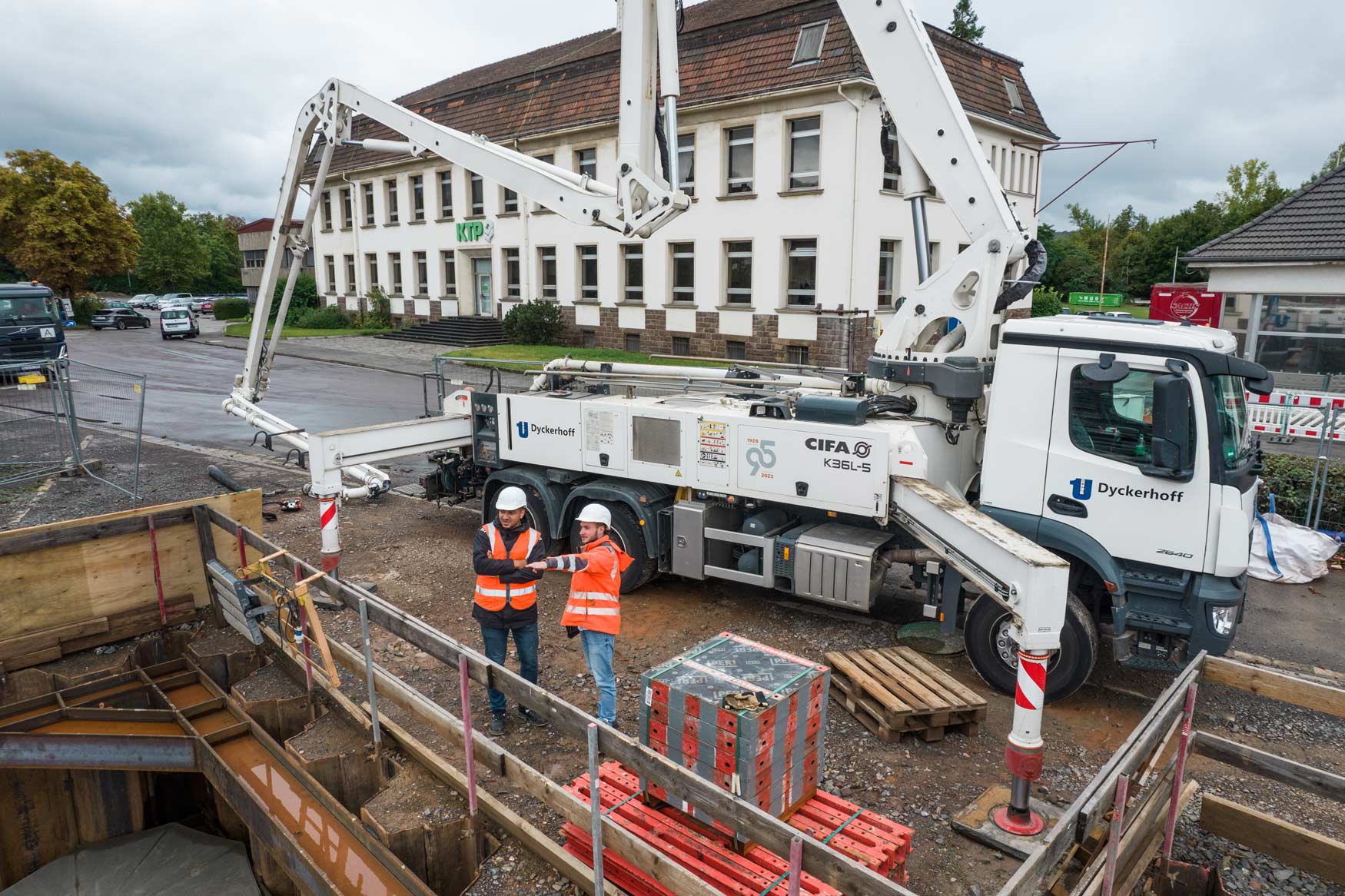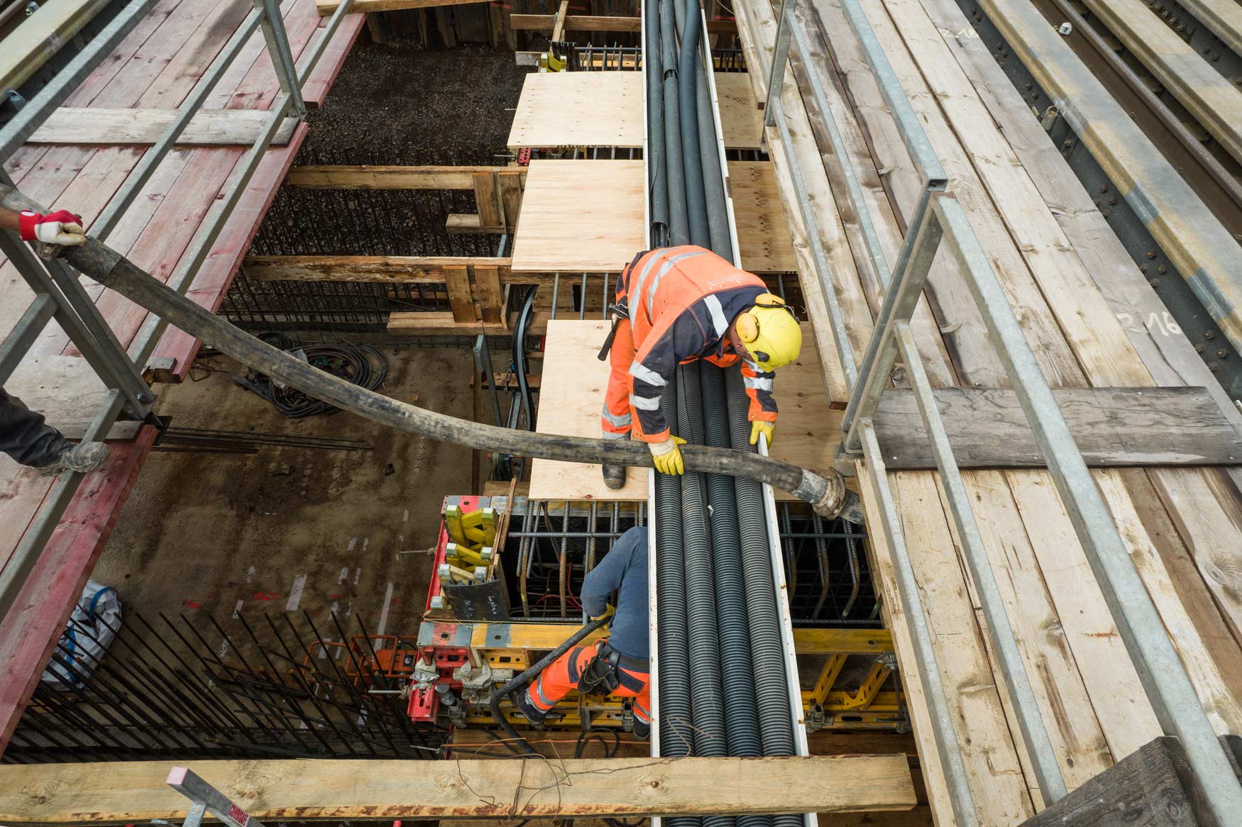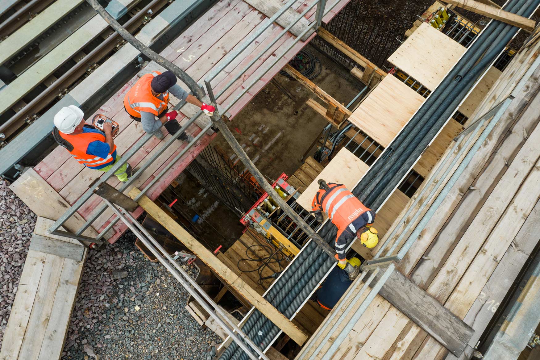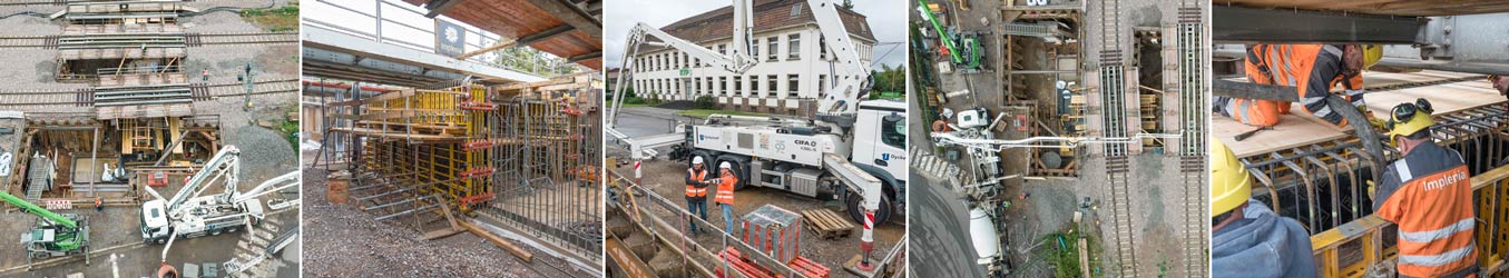 Im nächsten Schritt wurden dann im Rahmen von insgesamt vier genau getakteten Sperrpausen vier Hilfsbrücken eingehoben. Sie stellen sicher, dass der Zugverkehr während der gesamten Bauzeit weitgehend aufrechterhalten werden kann – eine logistische Leistung, die nicht zu unterschätzen ist. Unter diesen provisorischen Brücken wächst nun die neue Unterführung Stück für Stück heran. Die laufenden Beton- und Bewehrungsarbeiten sind dabei eine echte Herausforderung, da die Platzverhältnisse auf der Baustelle äußerst beengt sind und ein hohes Maß an präziser Koordination und durchdachter Planung erfordern.
