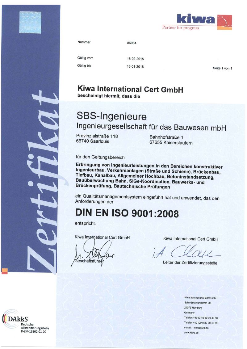 Im Rahmen eines Überwachungsaudit wurde Anfang Januar 2016 die bestehende Zertifizierung nach DIN EN ISO 9001:2008 unser beiden Büros in Saarlouis und Kaiserlautern erfolgreich bestätigt.