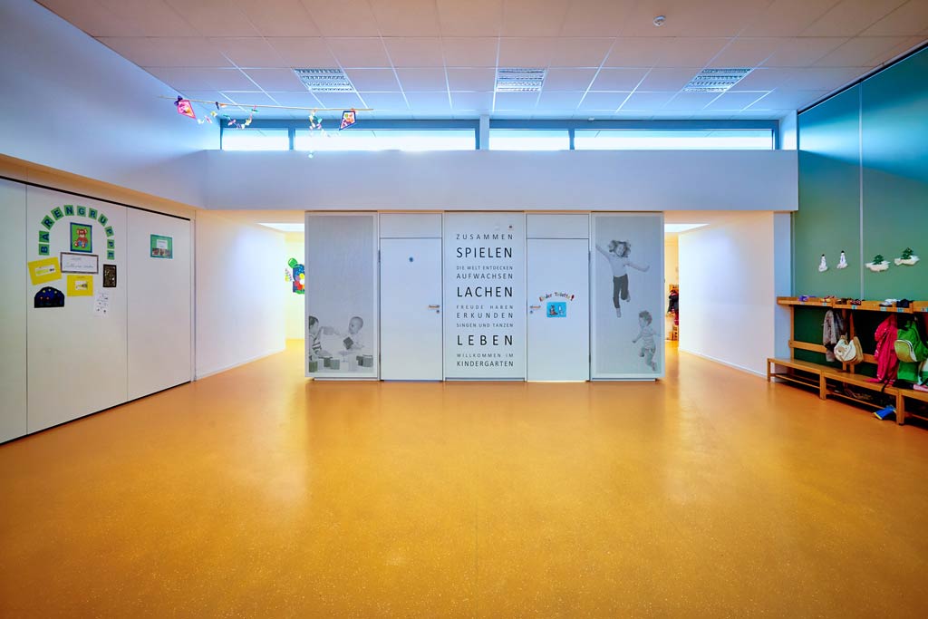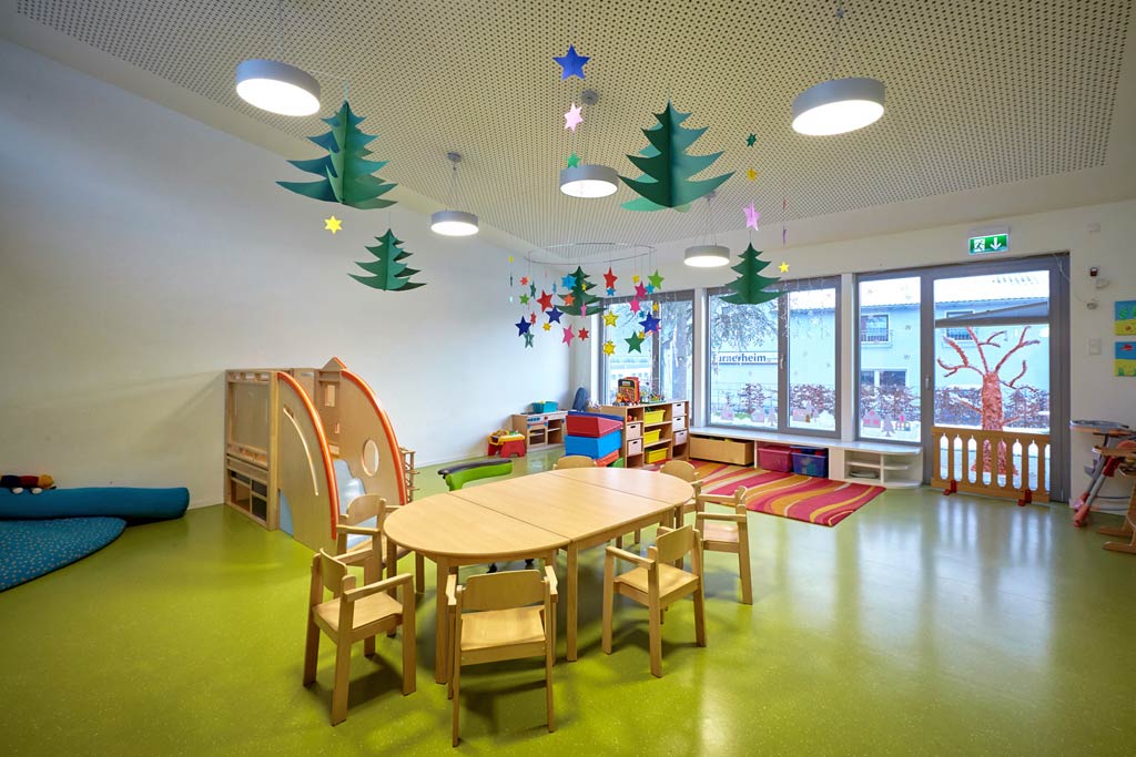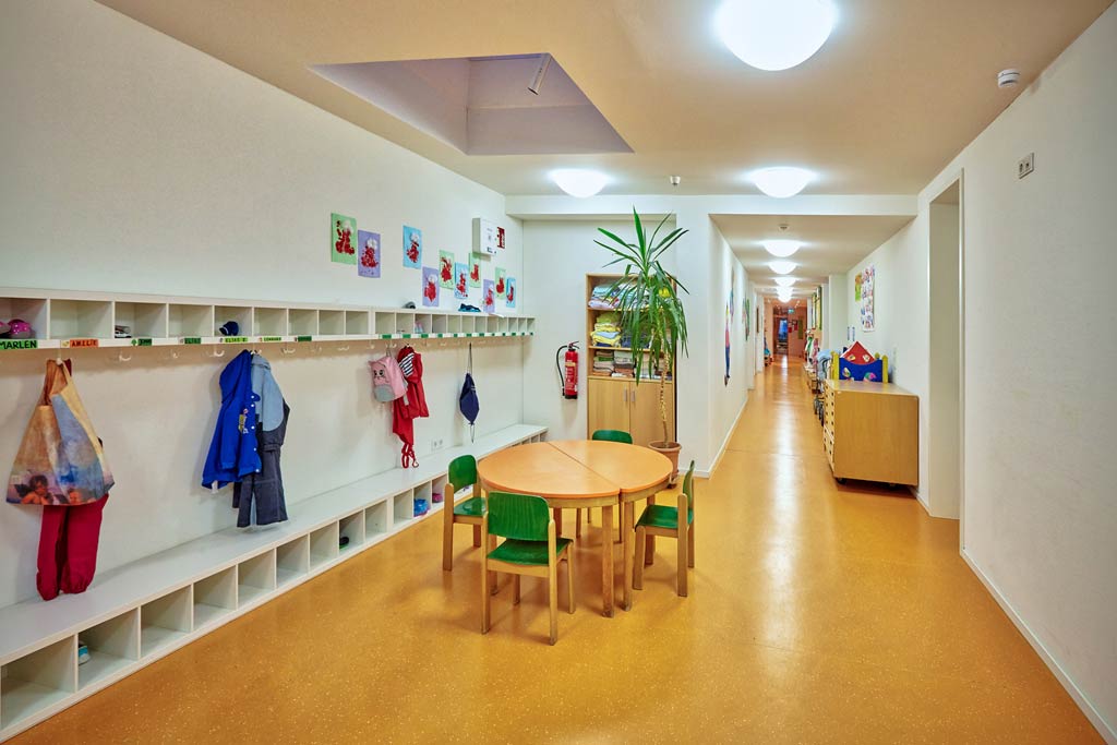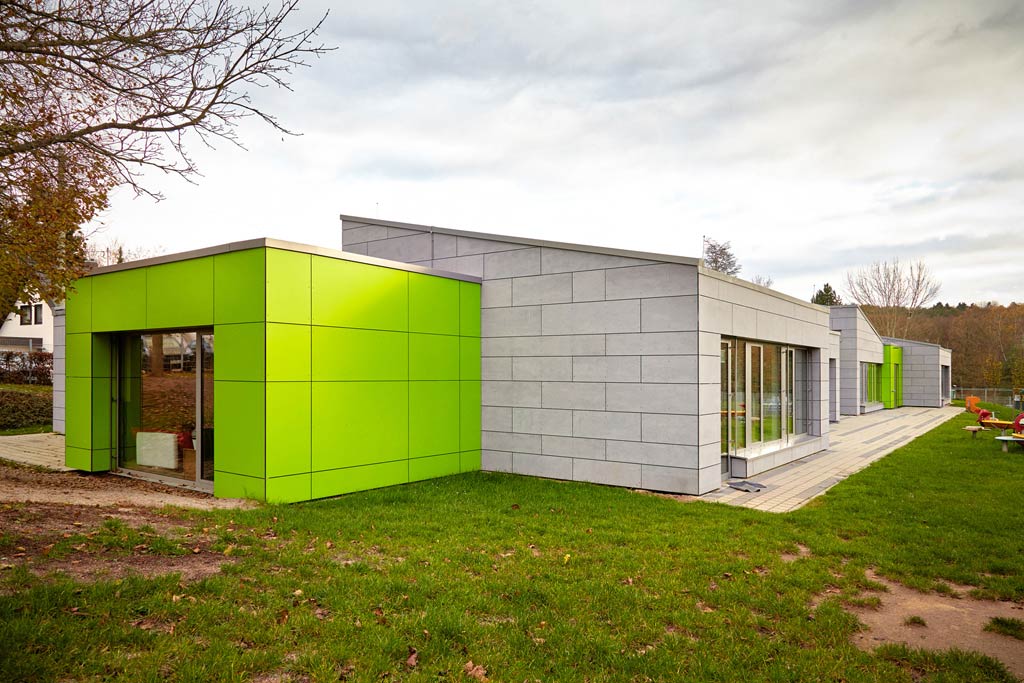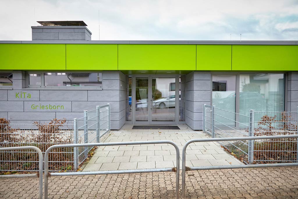 In den Jahren 2013 und 2014 wurde die 1975 erbaute Kindertagesstätte Griesborn in Schwalbach durch einen Erweiterungsbau vergrößert. Dabei wurden am Bestandsbauwerk tragende Innen- und Außenwände zurückgebaut und mehrere Wanddurchbrüche geschaffen. Der Erweiterungsbau umfasst den Anbau zweier einzelner Räume an der nordöstlichen bzw. südöstlichen Gebäudeecke (Personalraum bzw. Küche/Kinderküche) und den Anbau von zwei Krippenräumen inkl. Wickel- und Lagerräumen sowie Flurflächen an der südwestlichen Gebäudeecke. Die Abmessungen der beiden angebauten Einzelräume betragen ca. 7,58 x 5,65 m und ca. 6,33 x 5,65 m. Die Abmessungen des südwestlichen Anbaus betragen ca. 17,57 x 17,63 m. Der Erweiterungsbau wurde in Holzständerbauweise auf tragender Stahlbetonbodenplatte mit Flachdach bzw. Pultdach hergestellt. Die SBS-Ingenieure wurden mit der statischen Berechnung einschließlich Untersuchung der Dachkonstruktion, der erforderlichen Unterzüge, Stürze und Pfosten, sowie der Bodenplatten beauftragt und übernahmen in der Ausführungsphase die Sicherheits- und Gesundheitsschutzkoordination.
