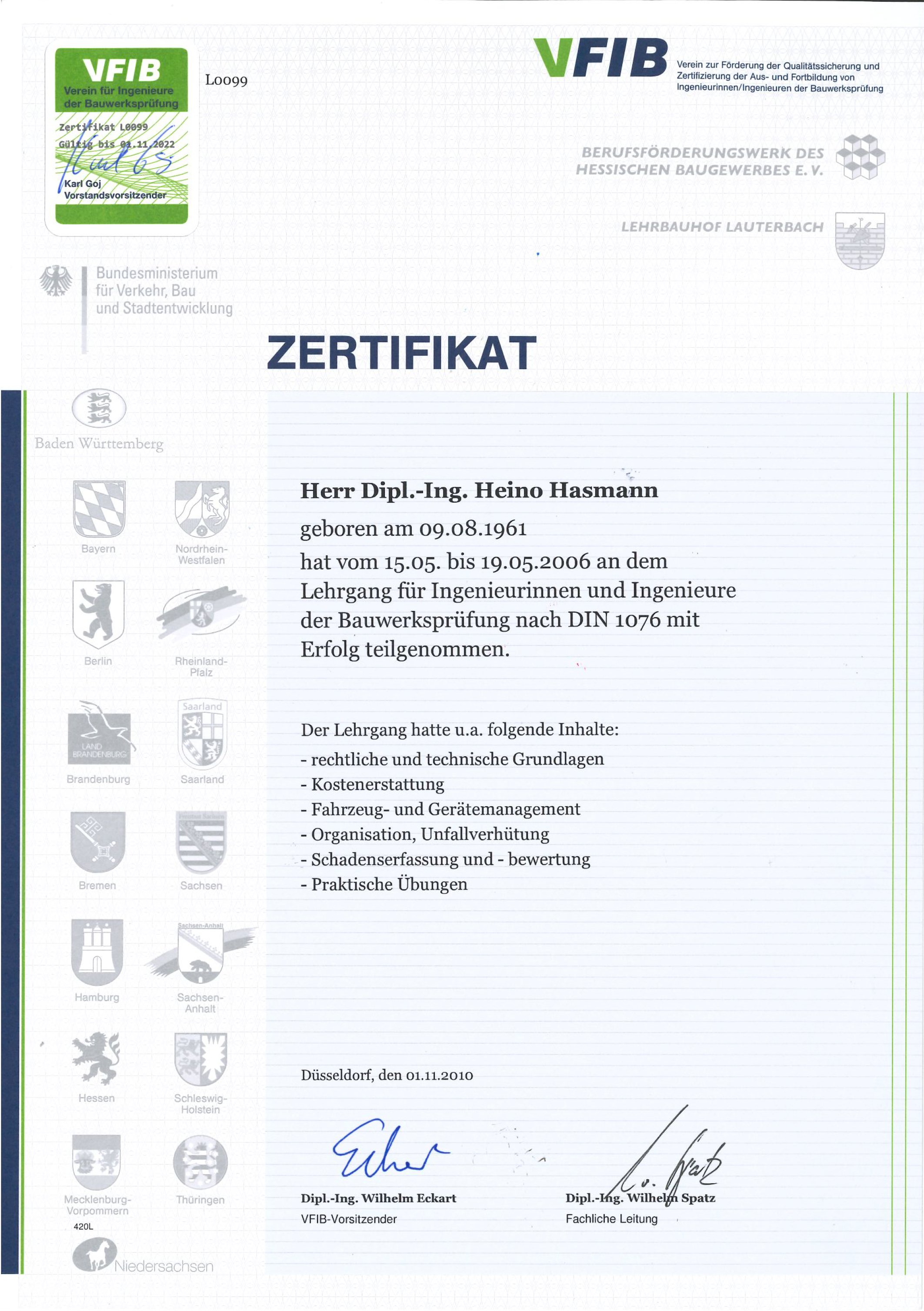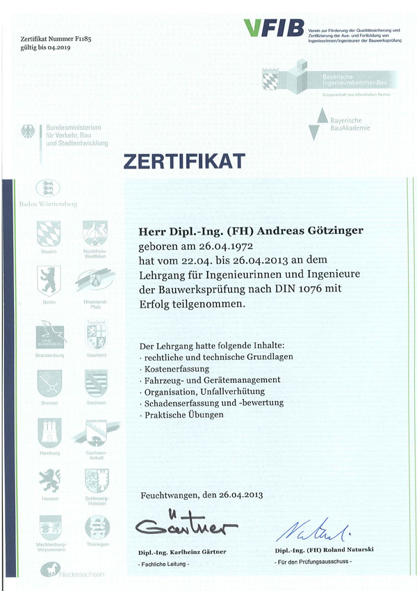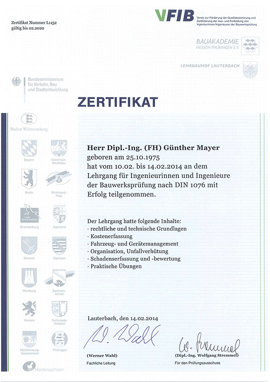 Die Qualität der Durchführung einer Bauwerks- und Brückenprüfung hängt unmittelbar von den handelnden Personen ab. Um die hohen Anforderungen, unabhängig von den erforderlichen Mindestvoraussetzungen der jeweils gültigen Norm (z.B. VDI 6200, DIN 1076 oder Ril 804), bestens erfüllen zu können, haben mehrere Mitarbeiter von SBS-Ingenieure beim Verein zur Förderung der Qualitätssicherung und Zertifizierung der Aus- und Fortbildung von Ingenieurinnen/Ingenieuren der Bauwerksprüfung (VFIB) ein Zertifikat gemäß DIN 1076 erworben: